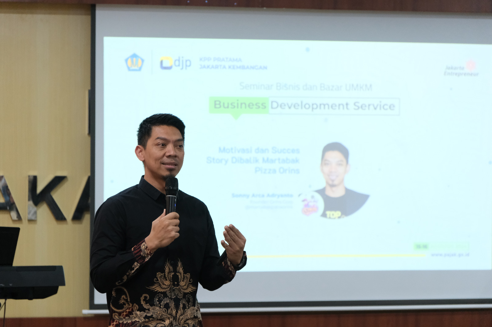 Salah satu narasumber yang dihadirkan, pemilik Martabak Pizza Orins Sonny Arca Adryanto memberikan paparan tentang perjalanan bisnisnya mulai dari tantangan, strategi pemasaran yang efektif hingga tips dalam mengelola keuangan dan pemanfaatan teknologi untuk memperluas jangkauan pasar.