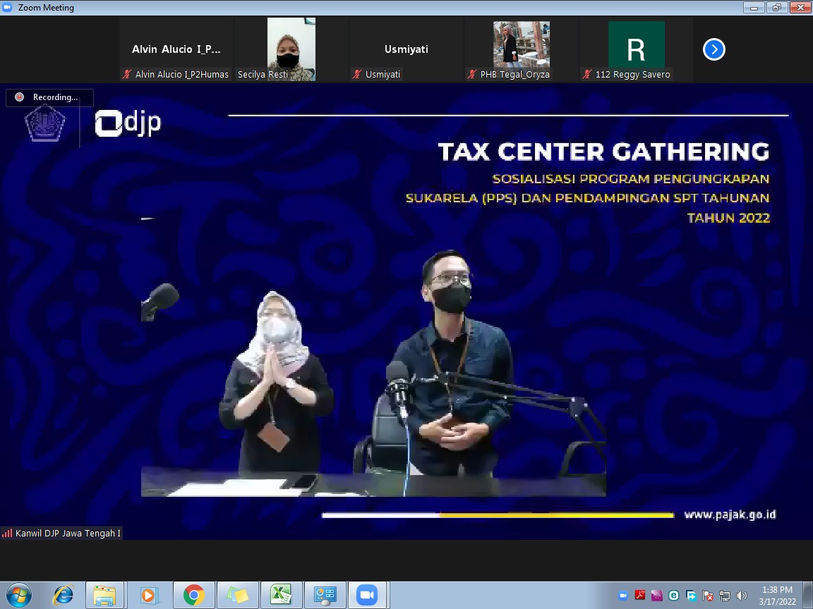 Kantor Wilayah Direktorat Jenderal Pajak (Kanwil DJP) Jawa Tengah I mengadakan acara Riung Tax Center dan Sosialisasi Program Pengungkapan Sukarela serta Pendampingan Pengisian Surat Pemberitahuan (SPT) Tahunan Tahun Pajak 2021 secara daring melalui aplikasi Zoom Cloud Meeting di Semarang (Kamis, 17/3).