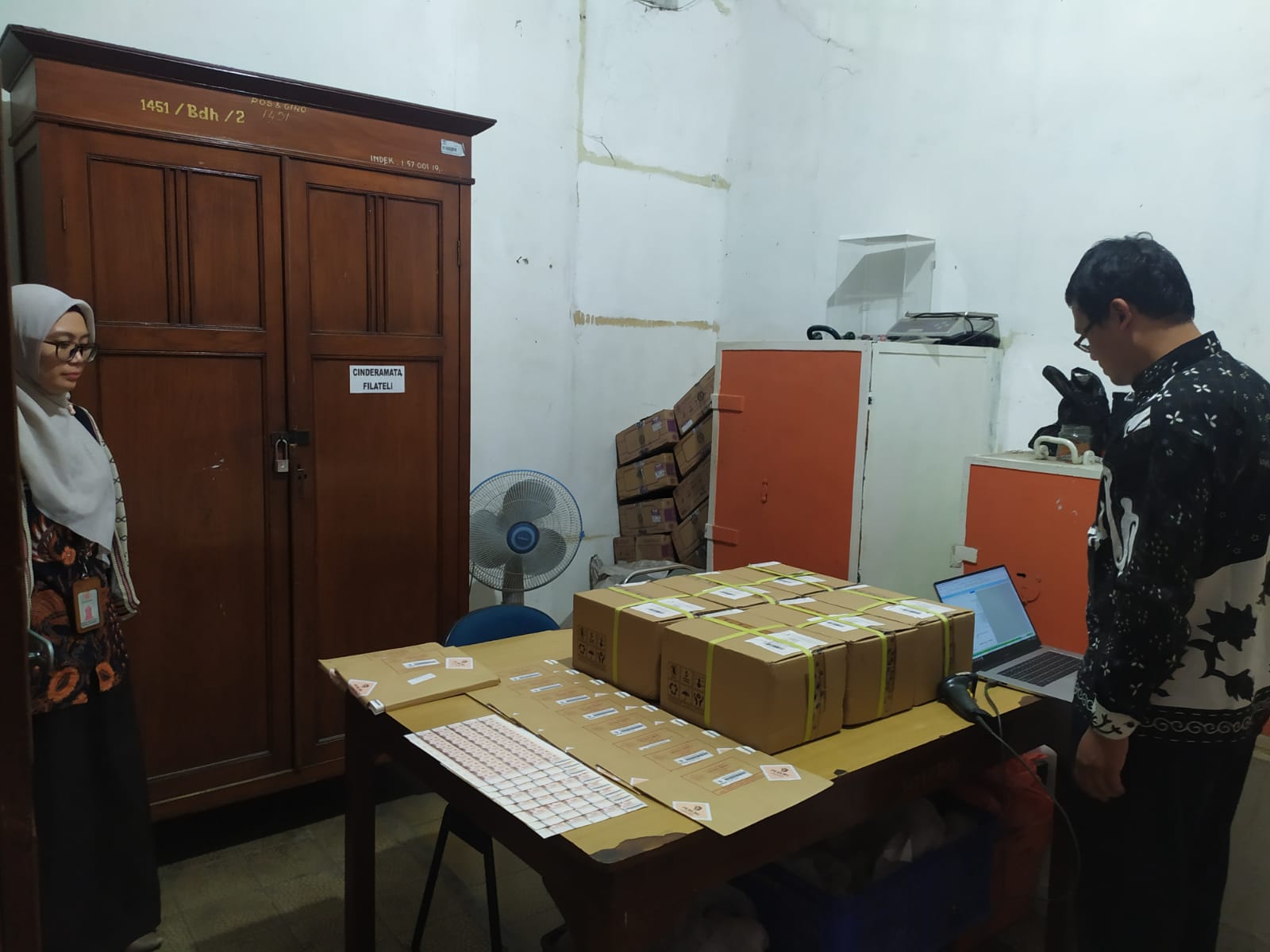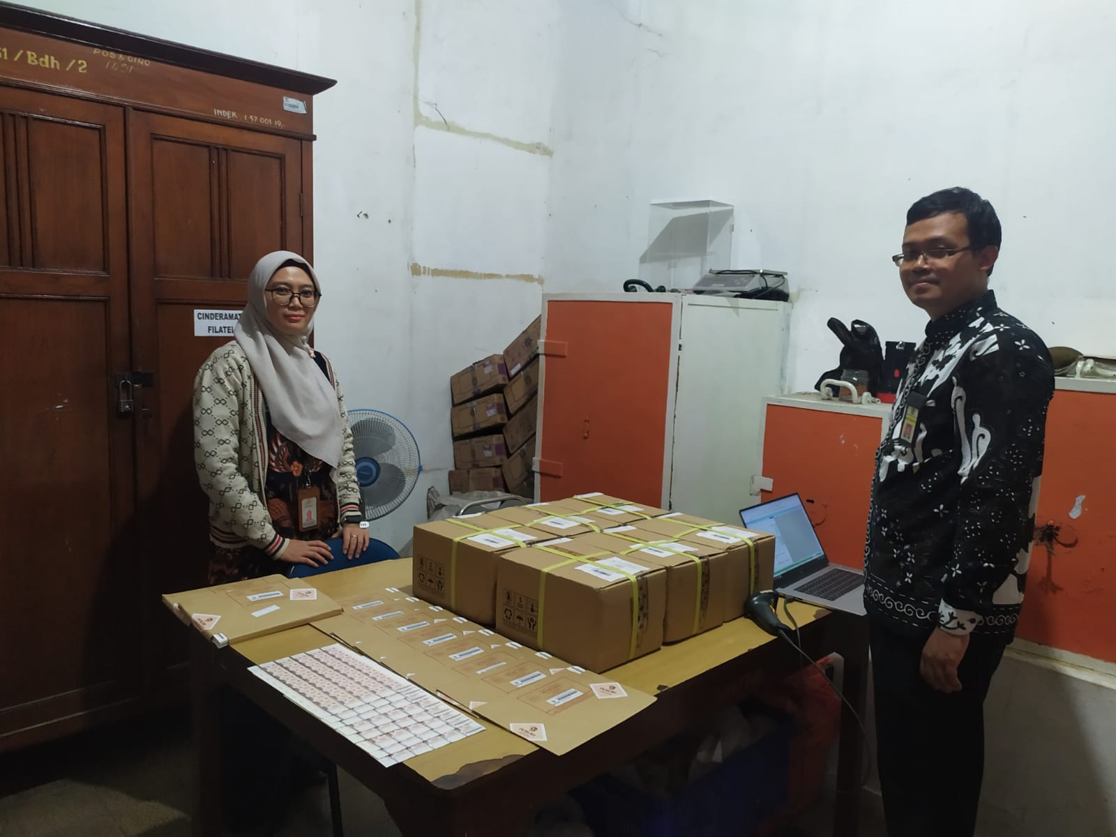 Happy Santoso selaku Account Representative KPP Pratama Cianjur melaksanakan kegiatan verifikasi meterai dengan didampingi oleh Supervisor Administrasi dan Umum KC PT Pos Indonesia (Persero) Cianjur Yunitia Oktaviyanti.