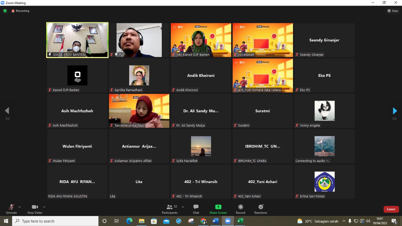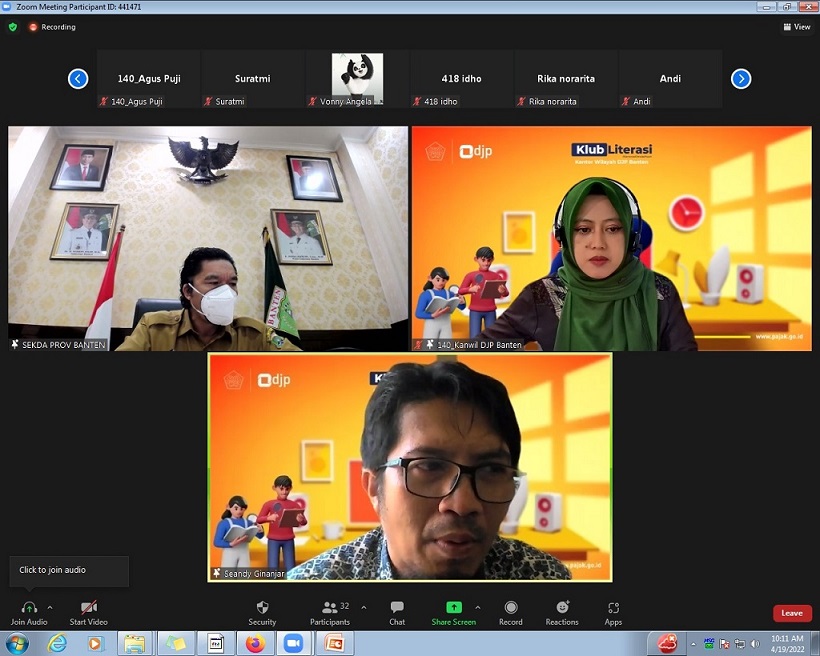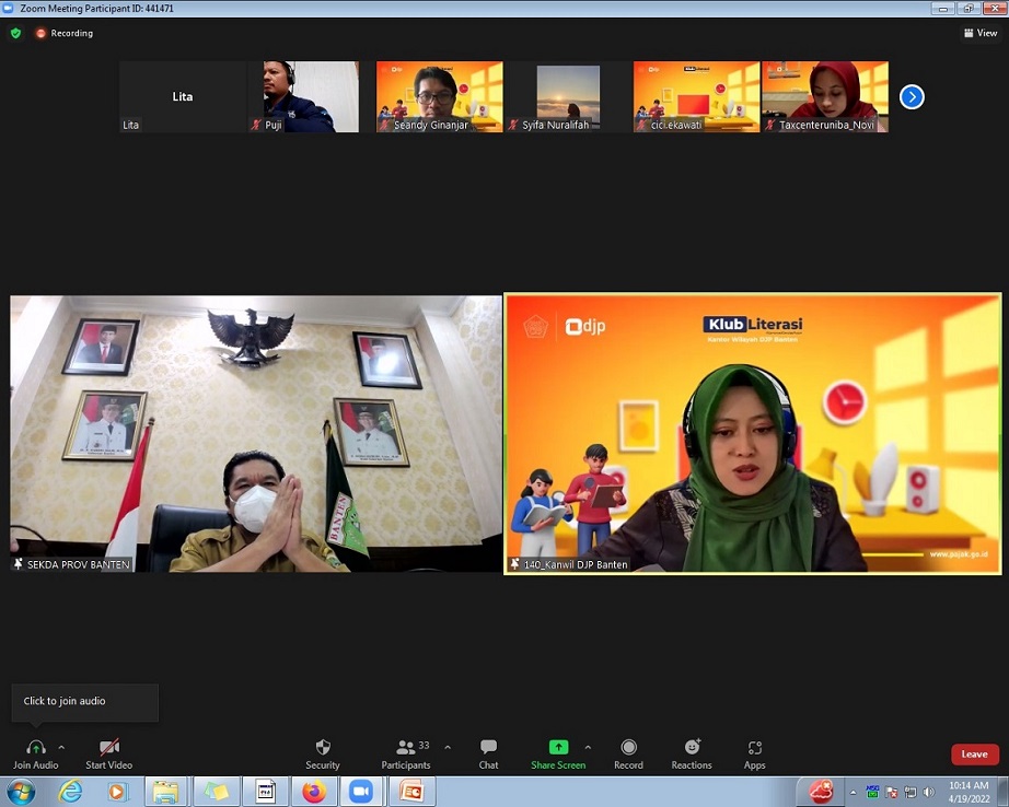 Kantor Wilayah Direktorat Jenderal Pajak (Kanwil DJP) Banten menggelar Club Literacy pertemuan keempat tahun 2022 bersama para pegawai, dosen, dan mahasiswa dari tax center di Lingkungan Kanwil DJP Banten dengan tema Inovasi Sektor Publik Meningkatkan Pelayanan Perpajakan Daerah di Kota Serang, Banten (Selasa, 19/4).