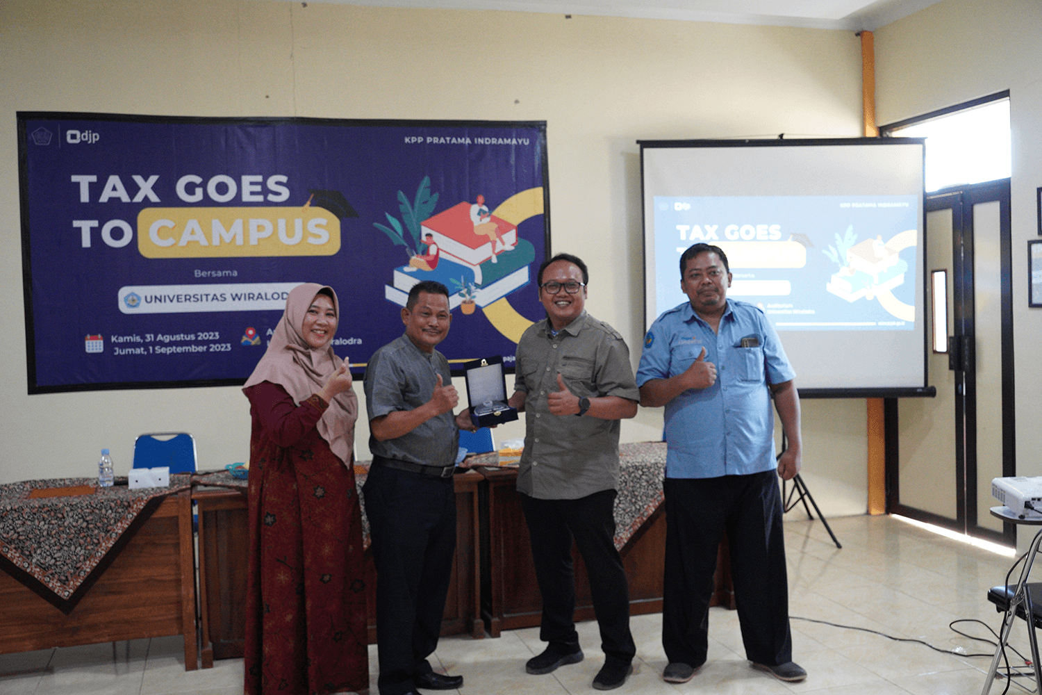 Kantor Pelayanan Pajak (KPP) Pratama Indramayu berkolaborasi dengan Tax Center Universitas Wiralodra mengadakan kegiatan "Tax Goes to Campus 2023" di ruang aula Fakultas Kesehatan Masyarakat Universitas Wiralodra, Kabupaten Indramayu (Kamis, 31/8). Acara ini berlangsung dalam tiga sesi selama dua hari sampai Jumat, 1 September 2023.