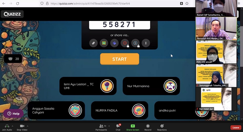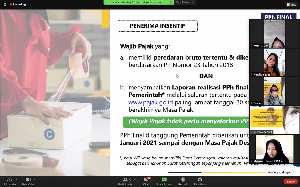 Kantor Wilayah Direktorat Jenderal Pajak (Kanwil DJP) Sulawesi Selatan, Barat, dan Tenggara (Sulselbartra) menggelar kegiatan Tax Goes To Campus (TGTC) secara daring (Kamis, 12/8). Kegiatan ini dilaksanakan bersama dengan tiga perguruan tinggi di Kota Makassar yakni Universitas Islam Negeri Alauddin Makassar, Universitas Islam Makassar, dan Universitas Muslim Indonesia Makassar. Acara ini dilangsungkan melalui aplikasi Zoom Meeting di ruang Bidang P2 Humas Kanwil DJP Sulselbartra, Kota Makassar.