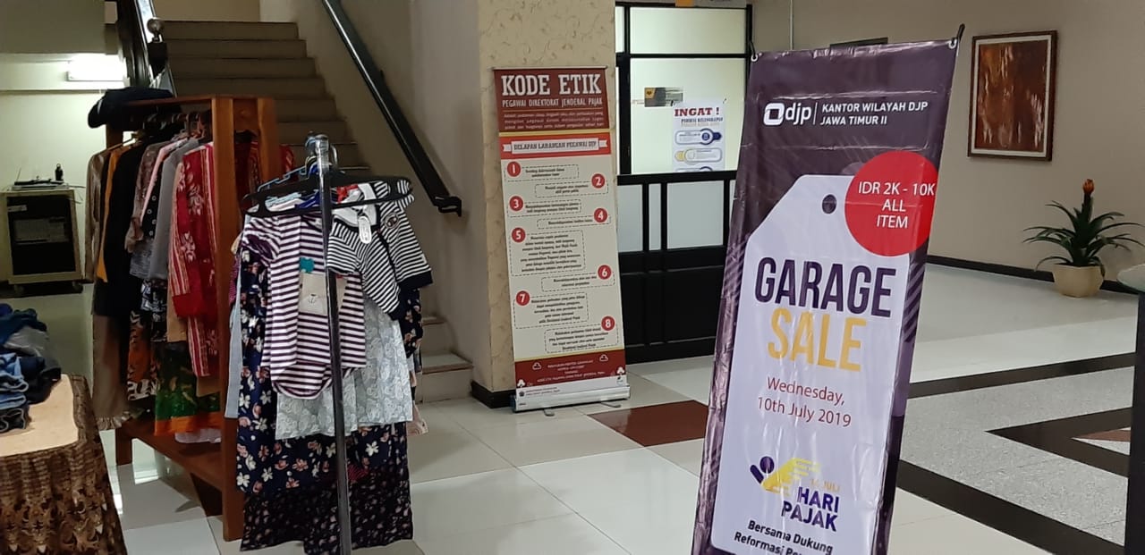 Kanwil DJP Jawa Timur II menggelar Garage Sale di lobi kantor di Sidoarjo (Rabu, 10/7). Garage Sale merupakan acara amal yang digagas Kanwil DJP Jatim II dalam rangka peringatan Hari Pajak 2019. Barang yang dijual adalah barang-barang milik para pegawai Kanwil DJP Jatim II yang disumbangkan karena sudah tidak terpakai namun kondisinya masih layak. Semua uang hasil penjualan akan disalurkan ke yayasan yatim atau anak-anak kurang mampu.