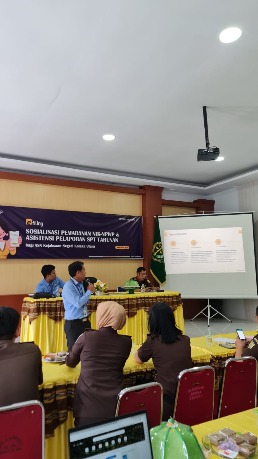 Kantor Pelayanan, Penyuluhan, dan Konsultasi Perpajakan (KP2KP) Lasusua mengadakan sosialisasi Pemadanan Nomor Induk Kependudukan (NIK) menjadi Nomor Pokok Wajib Pajak (NPWP) dan Asistensi Pelaporan SPT Tahunan di Aula Kejaksaan Negeri (Kejari) Kolaka Utara, Kabupaten Kolaka Utara (Rabu, 15/3). Kegiatan ini dihadiri oleh ASN dan Pegawai Pemerintah Non Pegawai Negeri (PPNPN) Kejari Kabupaten Kolaka Utara.