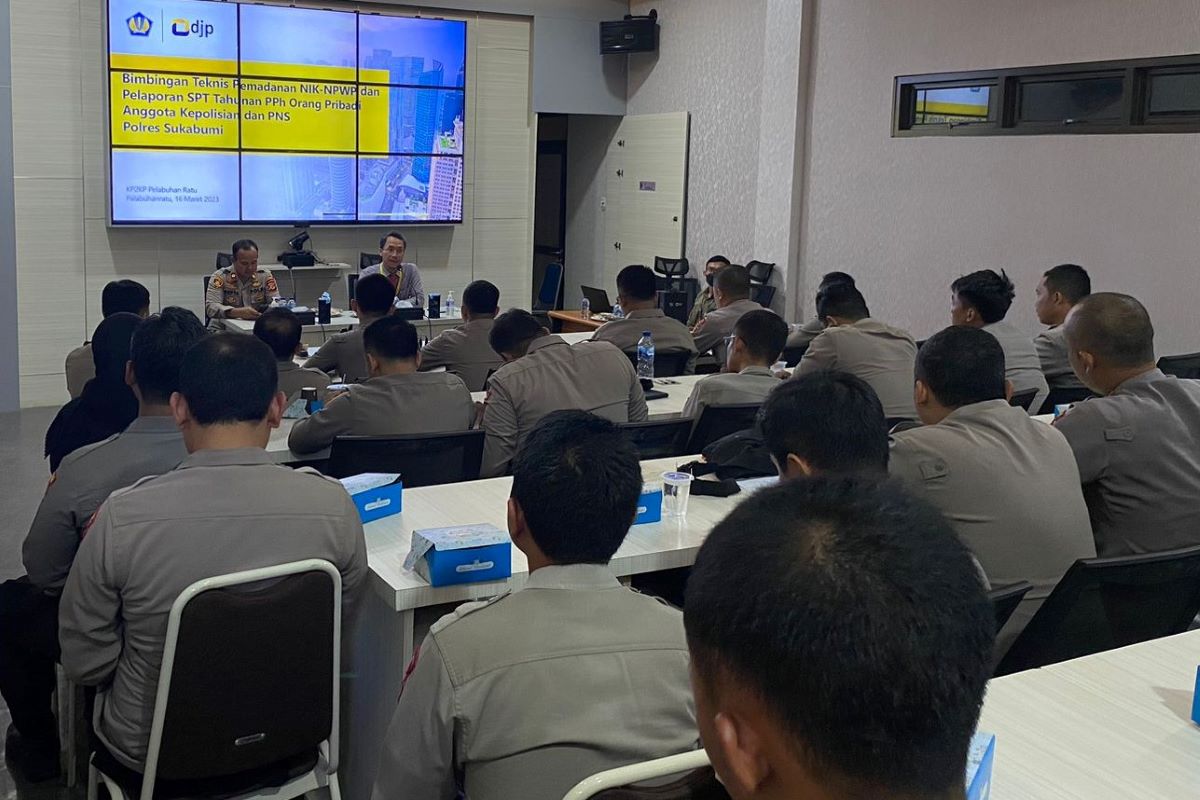 Kantor Pelayanan, Penyuluhan, dan Konsultasi Perpajakan (KP2KP) Pelabuhan Ratu mengadakan kegiatan Bimbingan Teknis Pelaporan Surat Pemberitahuan (SPT) Tahunan PPh tahun pajak 2022 dan Pemadanan Nomor Induk Kependudukan (NIK) sebagai Nomor Pokok Wajib Pajak (NPWP) bagi jajaran anggota Kepolisian Resor (Polres) Sukabumi di Aula Command Center Polres Sukabumi, Jalan Kompleks Perkantoran Jajaway, Pelabuhan Ratu, Kabupaten Sukabumi (Kamis, 16/3).