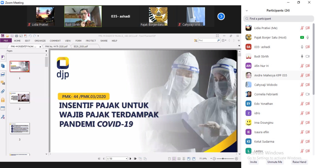 Kantor Pelayanan Pajak (KPP) Pratama Jakarta Kebon Jeruk Satu kembali menggelar kelas pajak daring (online) melalui aplikasi Zoom Meeting (Rabu, 10/6). Hal ini dilaksanakan karena masih banyak wajib pajak yang belum sepenuhnya memahami insentif pajak terkait Covid-19. Kelas pajak kali ini masih membahas seputar Peraturan Menteri Keuangan (PMK) Nomor 44/PMK.03/2020 tentang Insentif Pajak untuk Wajib Pajak Terdampak Pandemi Corona Virus Disease 2019.