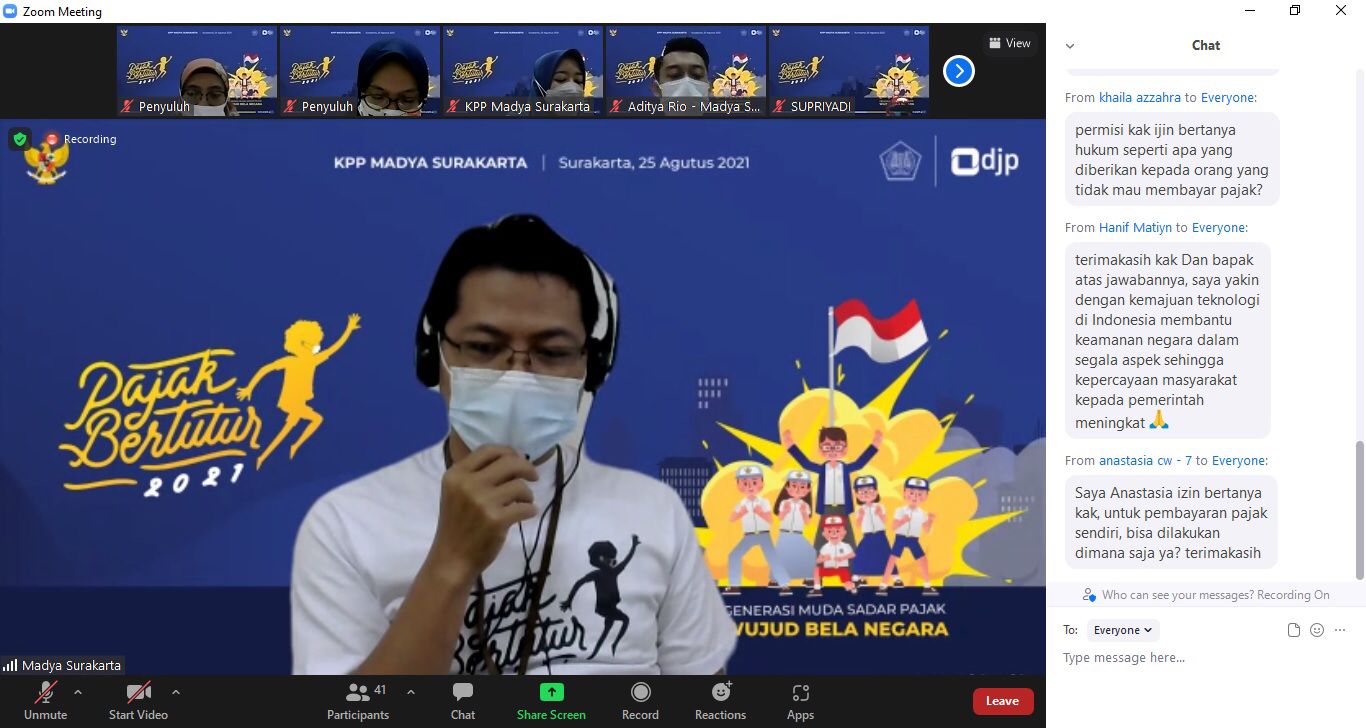 Kantor Pelayanan Pajak (KPP) Madya Surakarta menyelenggarakan Pajak Bertutur 2021 bersama dengan tiga puluh siswa-siswi SMA Negeri 7 Surakarta di Surakarta (Rabu, 25/8). Kegiatan ini dilaksanakan secara daring melalui media Zoom Meeting.