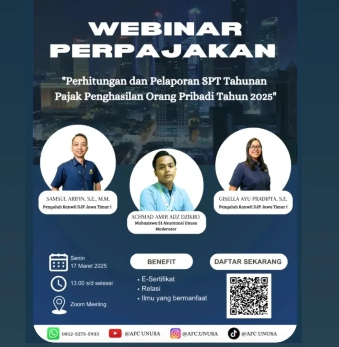 Kantor Wilayah Direktorat Jenderal Pajak (Kanwil DJP) Jawa Timur I bersama Accounting Finance Center (AFC) Universitas Universitas Nahdlatul Ulama Surabaya (UNUSA) menyelenggarakan kegiatan webinar perpajakan bertajuk “Perhitungan dan Pelaporan SPT Tahunan Pajak Penghasilan Orang Pribadi” secara daring melalui Zoom Meetings (Senin, 17/3).