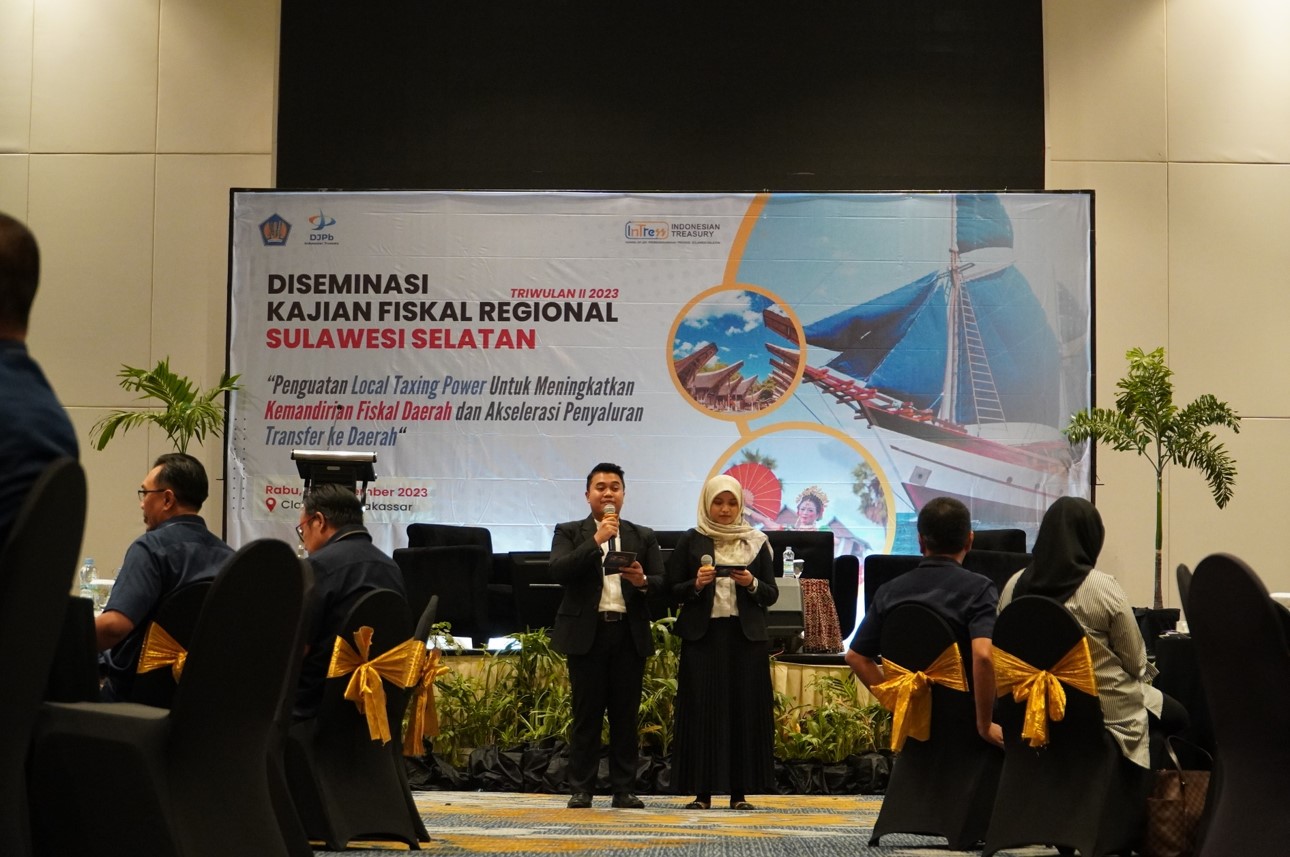 Diseminasi Kajian Fiskal Triwulan II Tahun 2023 Regional Sulawesi Selatan dihadiri oleh Kepala Kanwil DJP Sulselbartra Arridel Mindra, Kepala Kantor Wilayah Direktorat Jendral Perbendaharaan (DJPb) Provinsi Sulawesi Selatan Supendi, dan Kepala Badan Pendapatan Daerah Provinsi Sulawesi Selatan Reza Faisal Saleh.