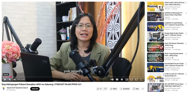 Kantor Wilayah Direktorat Jenderal Pajak (Kanwil DJP) Sumatera Utara II menyajikan edukasi perpajakan melalui podcast yang membahas topik “Implementasi Automatic Exchange of Information (AEOI) di Indonesia.” Tayangan ini dipublikasikan melalui kanal YouTube resmi Kanwil DJP Sumatera Utara II (Jumat, 23/5).