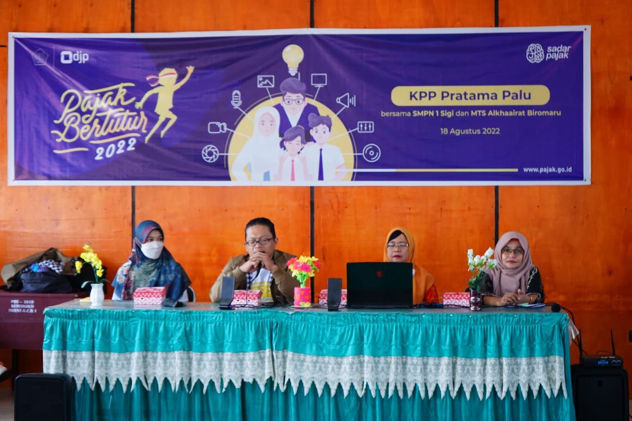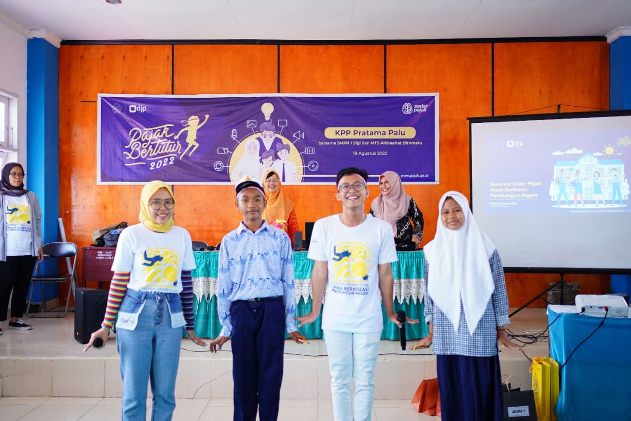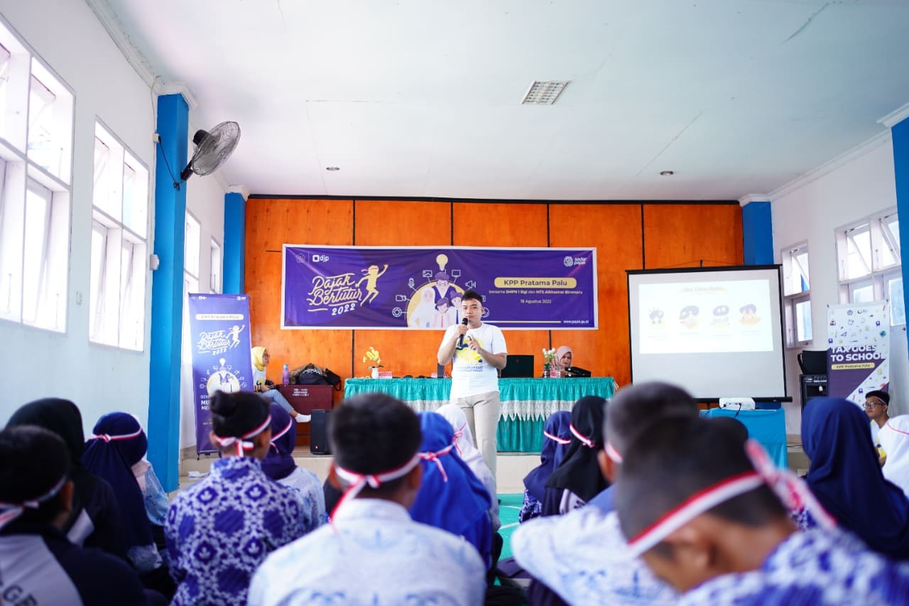 Tim Kantor Pelayanan Pajak (KPP) Pratama Palu melaksanakan kegiatan Pajak Bertutur 2022 yang secara serentak dilaksanakan oleh unit Direktorat Jenderal Pajak (DJP) di seluruh Indonesia. Dalam kesempatan ini, KPP Pratama Palu bersama delapan puluh pelajar turut menyukseskan kegiatan Pajak Bertutur di Sekolah Menengah Pertama Negeri (SMPN) 1 Sigi, Kecamatan Sigi Biromaru, Kabupaten Sigi (Kamis, 18/8).