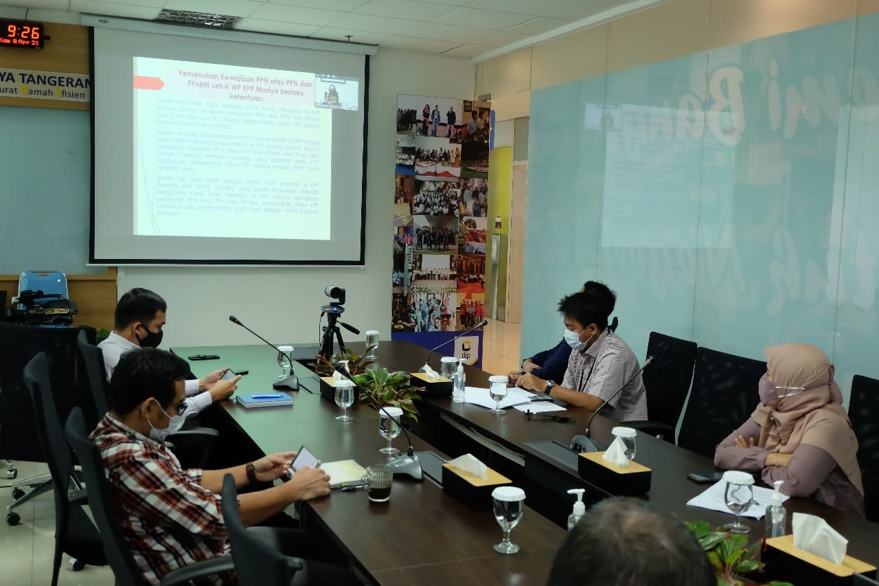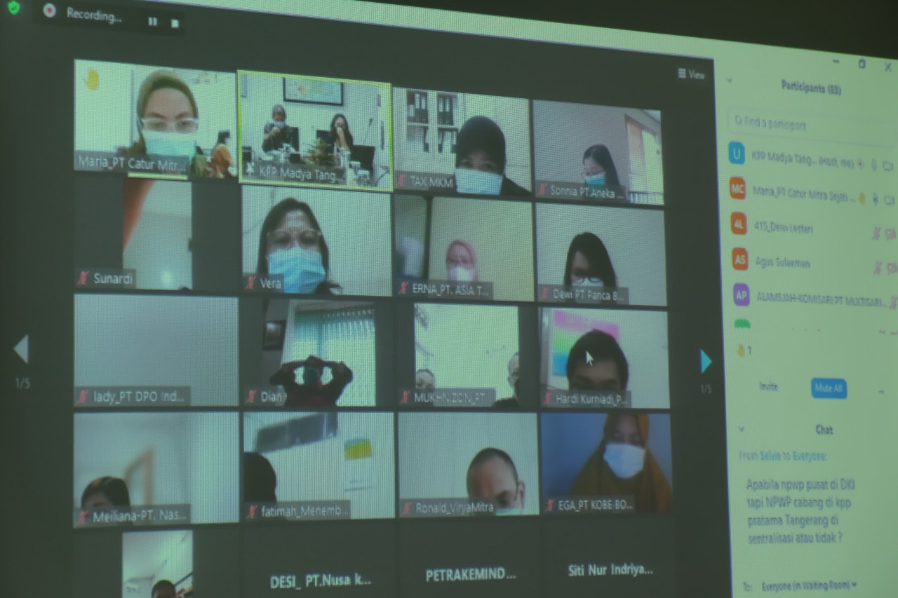 Sebanyak 94 wajib pajak mengikuti acara sosialisasi Peraturan Direktur Jenderal Pajak Nomor PER-05/PJ/2021sesi II yang diselenggarakan oleh KPP Madya Tangerang secara daring melalui aplikasi Zoom langsung dari Ruang Cisadane KPP Madya Tangerang (Kamis, 8/4).