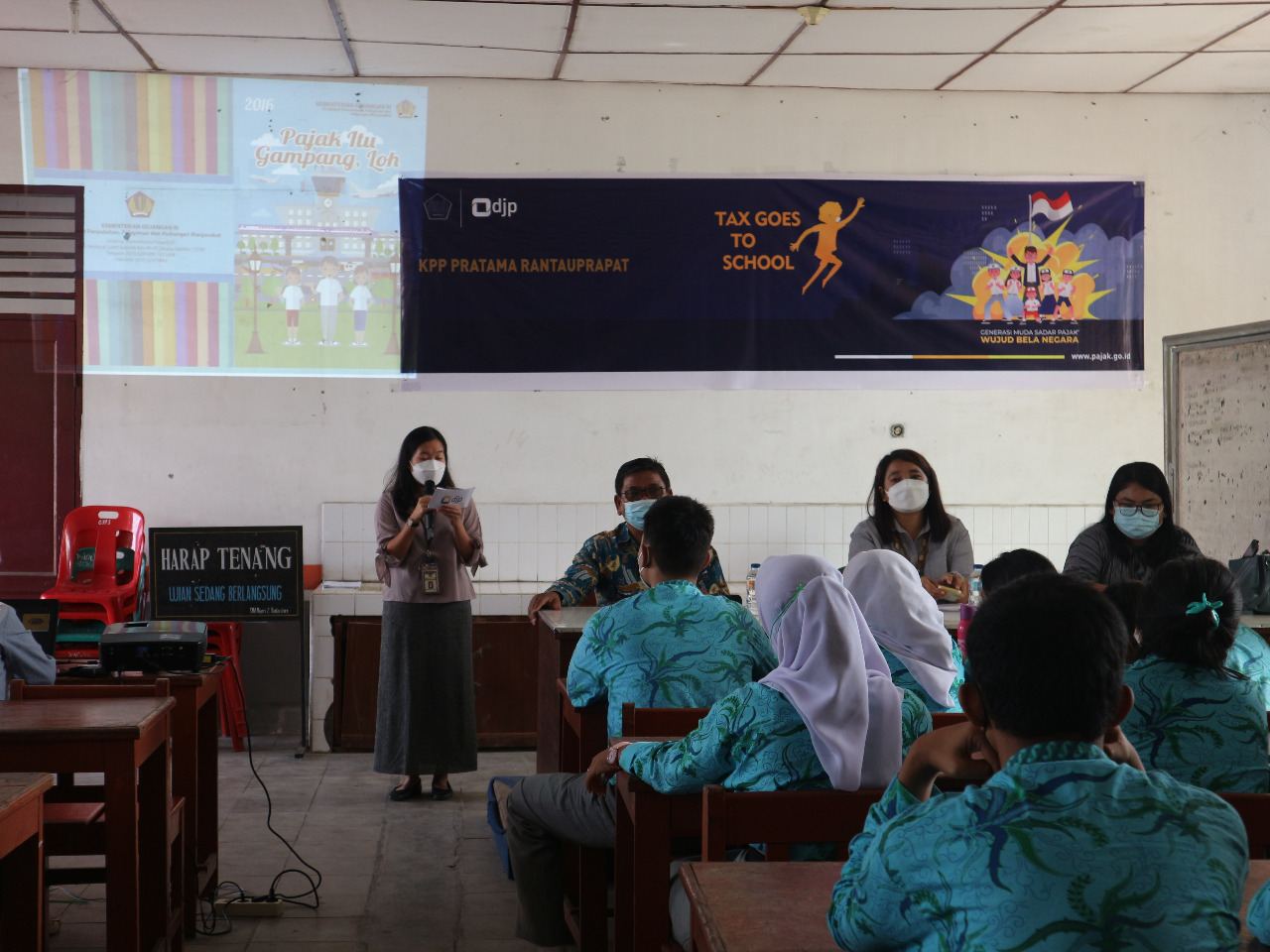 Kantor Pelayanan Pajak (KPP) Pratama Rantau Prapat mengadakan Tax Goes To School (TGTS) kepada para siswa Sekolah Menengah Atas (SMA) Negeri 2 Rantau Utara di Ruang Kelas SMA Negeri 2 Rantau Utara di Kelurahan Siringo-Ringo, Kecamatan Rantau Utara, Kabupaten Labuhan Batu, Sumatera Utara (Kamis, 4/11). Kegiatan yang diikuti oleh puluhan siswa ini diisi dengan pemaparan pengenalan pajak serta games seru.