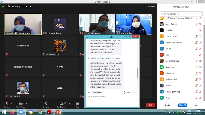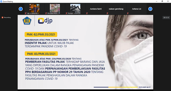 Kantor Pelayanan Pajak Madya Batam mengadakan sosialisasi PMK-83/PMK.03/2021 tentang Perpanjangan Insentif Perpajakan dalam rangka Penanganan Covid-19 secara daring kepada wajib pajak melalui Zoom Cloud Meeting di Batam, Kepulauan Riau (Rabu, 28/7).