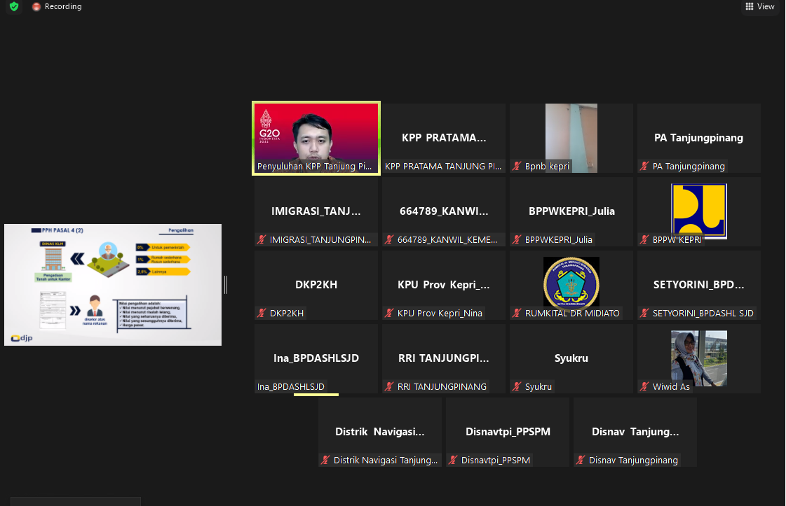 Kantor Pelayanan Pajak (KPP) Pratama Tanjung Pinang mensosialisasikan Peraturan Menteri Keuangan (PMK) Nomor: 59/PMK.03/2022 kepada Wajib Pajak Instansi Pemerintah Pusat di Wilayah Prov. Kepulauan Riau secara daring di Tanjung Pinang (Jumat, 20/5). Penyuluh KPP Pratama Tanjung Pinang, Syukrunaddawami menjadi narasumber pada sosialisasi ini yang bertujuan untuk menyampaikan regulasi terbaru terkait kewajiban perpajakan Instansi Pemerintah.