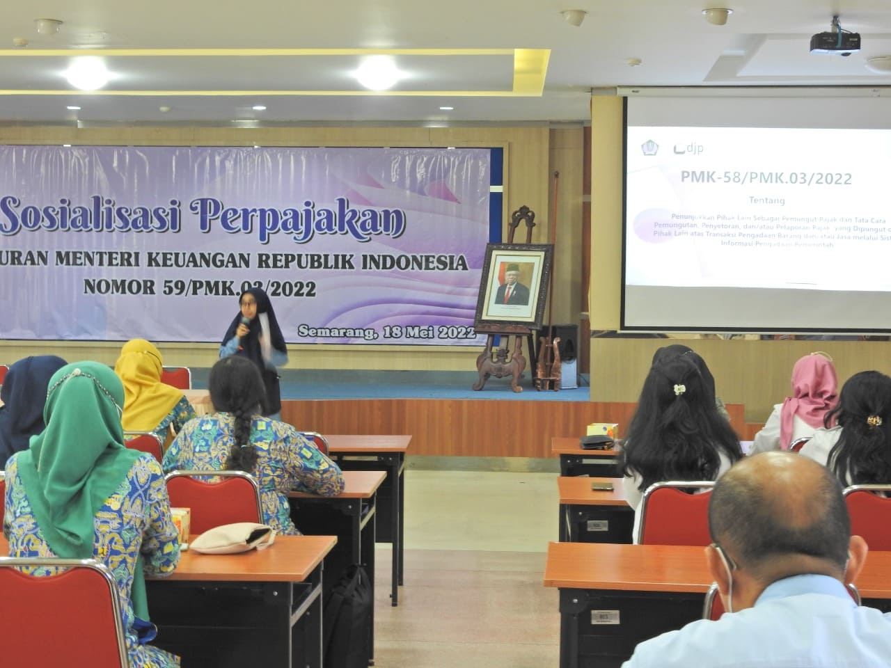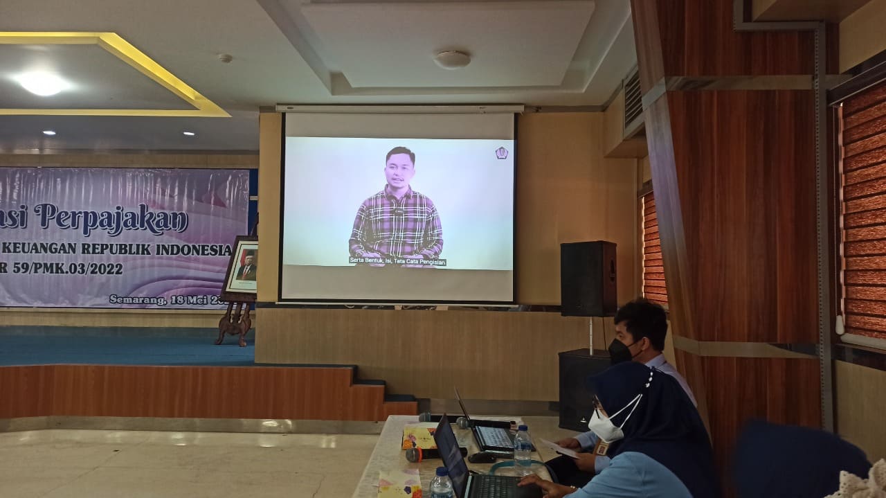 Kantor Pelayanan Pajak (KPP) Pratama Semarang Gayamsari menyelenggarakan sosialisasi Peraturan Menteri Keuangan Nomor 59/PMK.03/2022 tentang Tata Cara Pendaftaran dan Penghapusan Nomor Pokok Wajib Pajak, Pengukuhan dan Pencabutan Pengukuhan Pengusaha Kena Pajak, Serta Pemotongan dan/atau Pemungutan, Penyetoran, dan Pelaporan Pajak Bagi Instansi Pemerintah di Aula Gedung Keuangan Negara 1 Semarang (Rabu, 18/5).