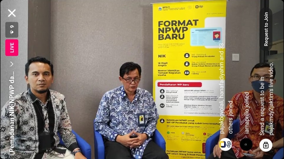 Kantor Pelayanan Pajak (KPP) Madya Dua Jakarta Timur mengadakan siaran langsung melalui Instagram dengan tema Pemadanan Nomor Identitas Kependudukan (NIK) menjadi Nomor Pokok Wajib Pajak (NPWP) di Jakarta (Jumat, 17/02). Acara dipandu secara langsung dari Ruang Konsultasi Lantai I, KPP Madya Dua Jakarta Timur oleh Tim Fungsional Penyuluh Pajak.