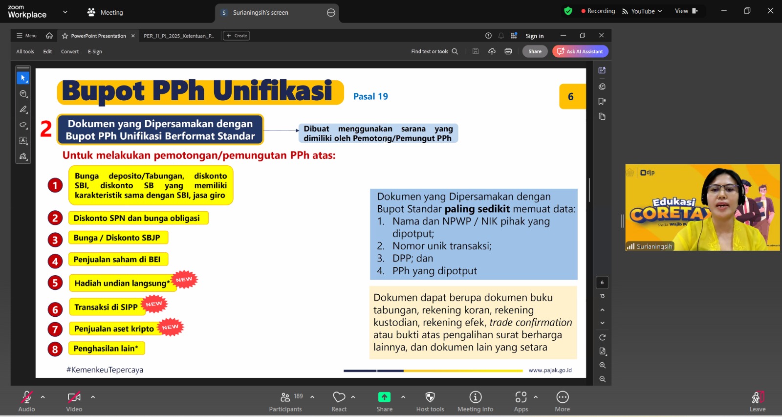 “Terdapat hal-hal baru yang perlu dicermati terkait dokumen yang dipersamakan dengan bukti pemotongan dan/atau pemungutan pajak penghasilan unifikasi berformat standar yang diatur dalam PER-11/PJ/2025 ini,” ujar Surianingsih mengawali penjelasannya.