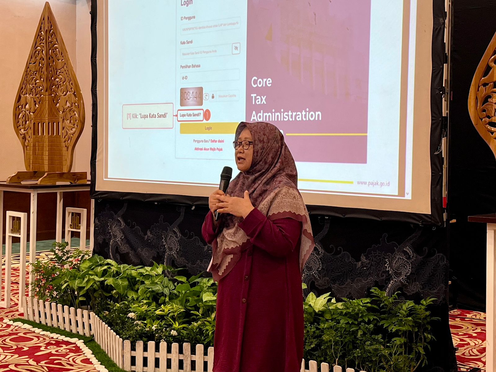 Setelah para peserta selesai melakukan aktivasi akun Coretax dan pembuatan kode otorisasi DJP, acara dilanjutkan dengan simulasi pelaporan SPT Tahunan melalui Coretax DJP yang disampaikan oleh Za'imatul Habibah selaku Penyuluh Pajak.