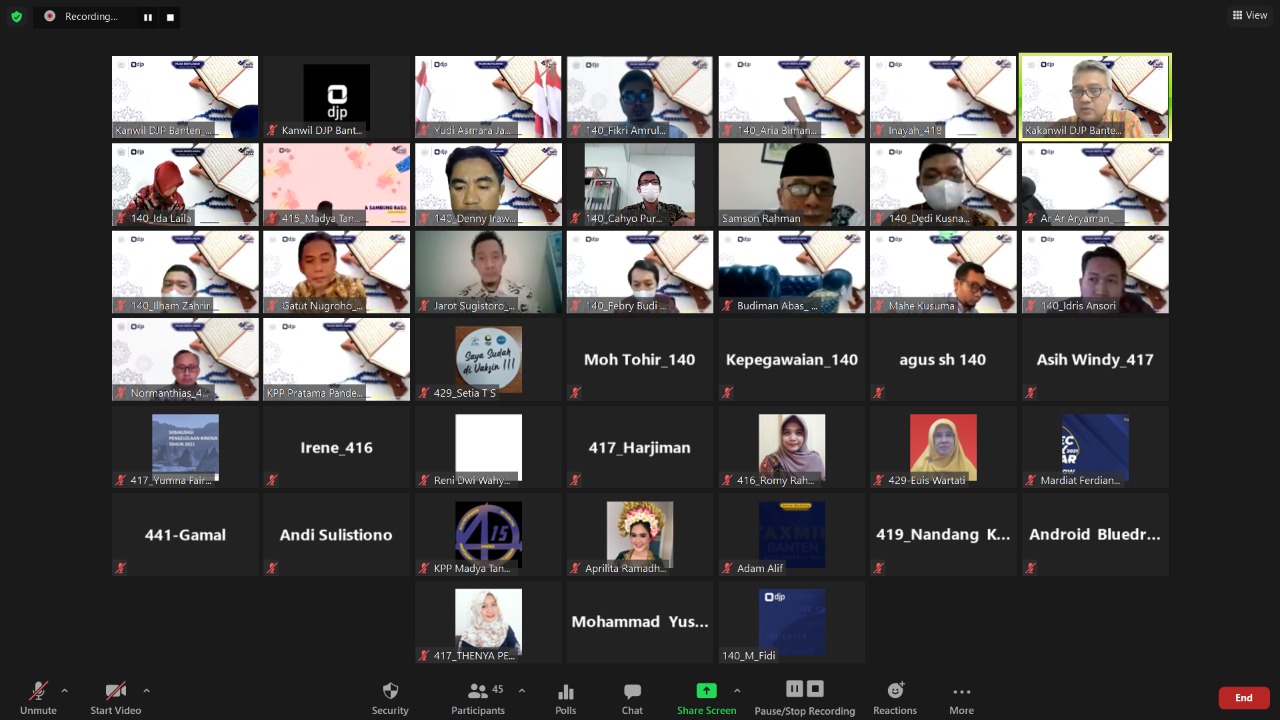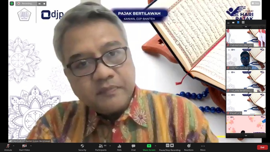 Kantor Wilayah Direktirat Jenderal Pajak (DJP) Banten menggelar kegiatan kajian keagamaan secara virtual melalui Zoom Cloud Meeting sebagai acara puncak kegiatan Pajak Bertilawah sebagai bagian dari peringatan Hari Pajak 2021 di Kota Serang (Selasa, 13/7).