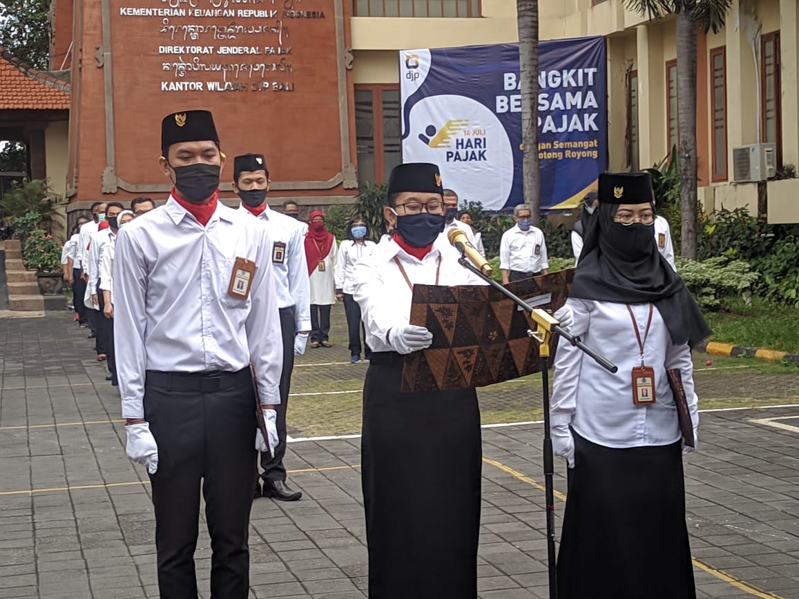 Dalam pembacaan sambutan yang disampaikan oleh Goro Ekanto Kepala Kanwil DJP Bali, mengajak seluruh pegawai DJP untuk memahami peringatan hari pajak ini dan selalu bersama-sama berjuang melawan Corona Virus Disease 2019 (Covid-19) serta selalu semangat dan berjuang dalam menghimpun penerimaan negara. Dalam upacara ini seluruh peserta melakukan protokol kesehatan dengan selalu menggunakan masker dan menjaga jarak satu meter.