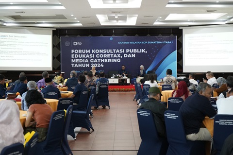 Kantor Wilayah Direktorat Jenderal Pajak Sumatera Utara I (Kanwil DJP Sumut I) menyelenggarakan Forum Konsultasi Publik, Edukasi Coretax, dan Media Gathering Tahun 2024 di Aula Istana Maimun, Gedung Kanwil DJP Sumut I, Kota Medan (Kamis, 21/11). Acara ini dihadiri oleh beragam peserta, termasuk wajib pajak, tokoh masyarakat, akademisi, perwakilan tax center, media, asosiasi profesi, pengusaha, serta pejabat instansi pemerintah.