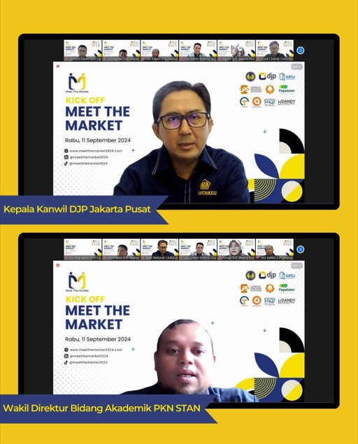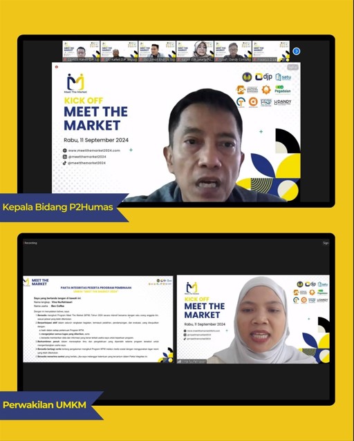 Kantor Wilayah Direktorat Jenderal Pajak (DJP) Jakarta Pusat melaksanakan Soft Launching Program Meet The Market 2024 (Rabu, 11/9). Kegiatan ini dilaksanakan secara daring dan dihadiri oleh seluruh Kepala Kantor di lingkungan Kantor Wilayah DJP Jakarta Pusat, perwakilan berbagai mitra kolaborasi mulai dari Wakil Direktur Bidang Akademik Politeknik Keuangan Negara (PKN) STAN, Kepala Departemen Pengelolaan Dana dan Bina UMKM PT Pegadaian (Persero), Kepala Divisi Pengelolaan Transformasi Lembaga Penjamin Simpanan (LPS), Direktur Grup Layanan Umum selaku Ketua Unit Pengumpulan Zakat LPS, perwakilan dari Antzman Indonesia serta diikuti oleh 20 pelaku Usaha Mikro, Kecil, dan Menengah (UMKM) peserta program Meet The Market 2024.