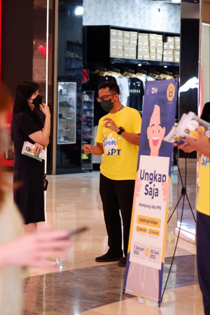 Bentuk kegiatan berupa pembagian masker, hand sanitizer, dan tisu sebanyak 75 paket serta mengajak dan mengingatkan pengunjung untuk segera melaporkan SPT Tahunan dan menginformasikan Program Pengungkapan Sukarela (PPS) yang dapat dimanfaatkan hingga 30 Juni 2022.
