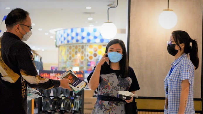 Seruan untuk menyampaikan SPT Tahunan diiringi dengan pembagian anti bacterial kit 3in1 sebanyak 50 paket dan selebaran tentang informasi SPT Tahunan kepada pengunjung mall.