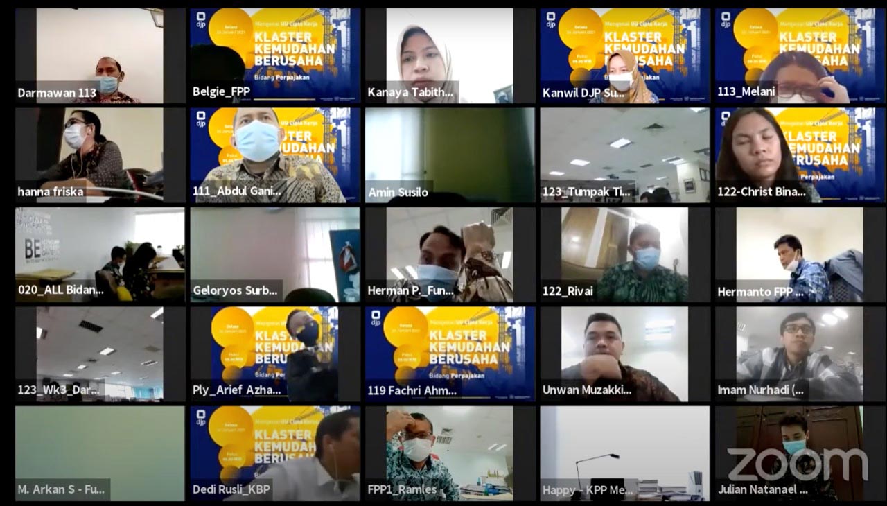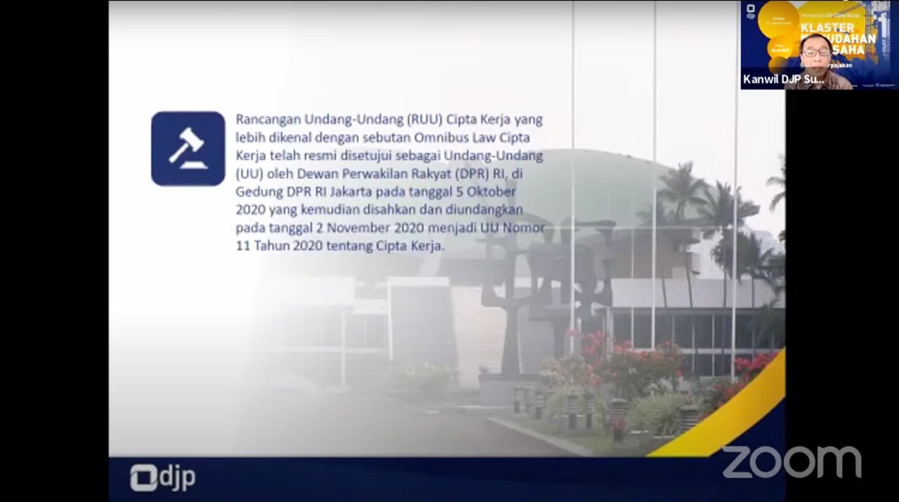 Kantor Wilayah (Kanwil) Direktorat Jenderal Pajak (DJP) Sumatera Utara I (Sumut I) melasanakan kegiatan Sosialisai UU Cipta Kerja kepada para pegawai di Lingkungan Kanwil DJP Sumut I di ruang virtual aplikasi zoom yang berlokasi di Medan (Selasa, 26/1).