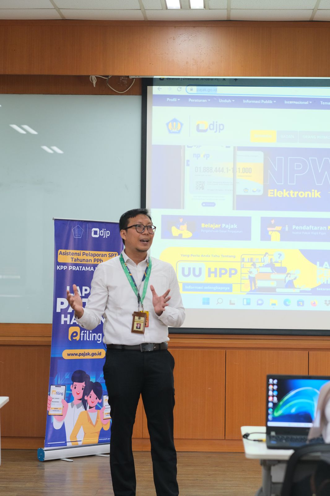 Materi pada acara kali ini disampaikan oleh penyuluh pajak ahli pertama KPP Pratama Kosambi Susilo Prasetyo Utomo yaitu mengenai pelaporan SPT Tahunan dan pemadanan NIK menjadi NPWP.