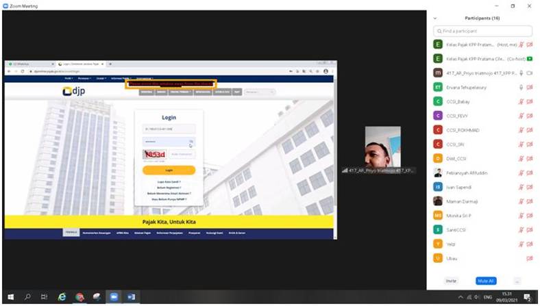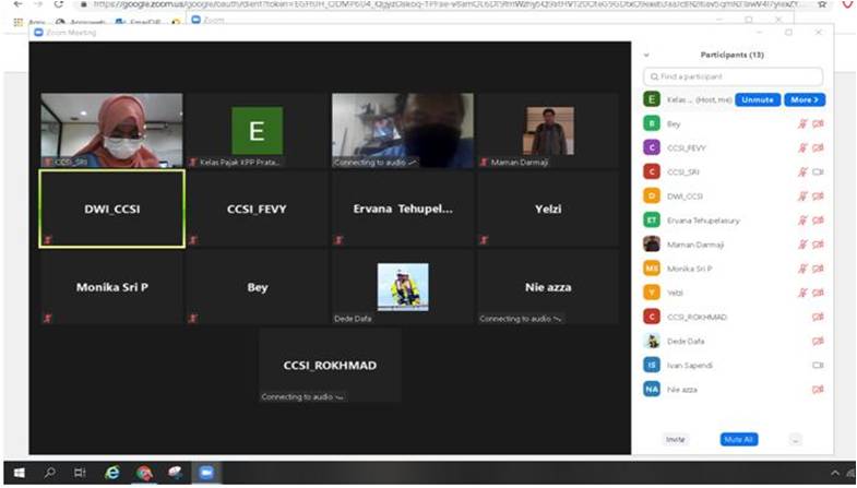 Karyawan PT Communication Cable Systems Indonesia Tbk (PT CCSI) mengikuti kelas pajak daring yang diselenggarakan Kantor Pelayanan Pajak (KPP) Pratama Cilegon melalui media aplikasi Zoom meeting (Selasa, 9/3). Dari KPP Pratama Cilegon, Cilegon, Banten, Account Representative dari Seksi Ekstensifikasi dan Penyuluhan Priyo Atmojo memandu acara sosialisasi pengisian SPT Tahunan PPh Orang Pribadi tersebut.