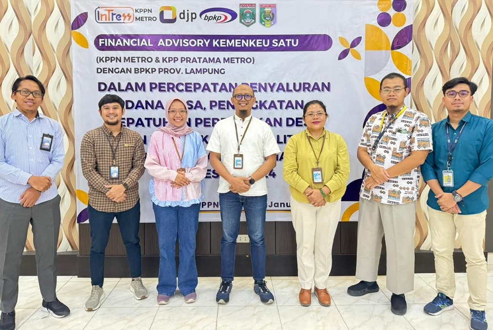 Kantor Pelayanan Pajak (KPP) Metro dan Kantor Pelayanan Perbendaharaan Negara (KPPN) Metro bersama dengan Badan Pengawasan Keuangan dan Pembangunan (BPKP) Provinsi Lampung menggelar acara Bimbingan Teknis terkait Kepatuhan Perpajakan atas Penggunaan dan Alokasi Dana Desa kepada seluruh Kepala Desa di wilayah Kabupaten Lampung Tengah dan Lampung Timur yang bertempat di Aula KPPN Metro, Jalan Seminung Nomor 5, Imopuro, Kecamatan Metro Pusat, Kota Metro, Lampung (Kamis, 25/1). Kegiatan ini dilaksanakan dalam rangka Financial Advisory Kementerian Keuangan (Kemenkeu) Satu.