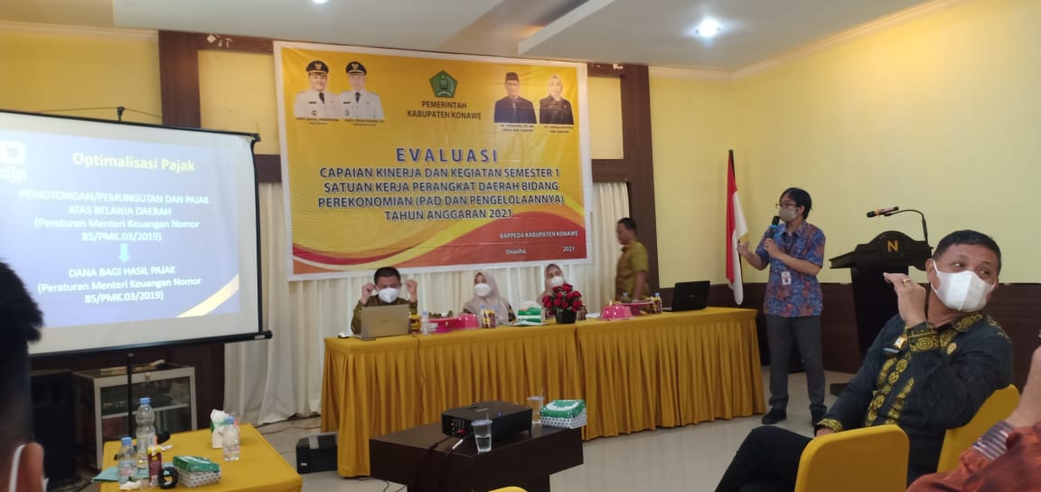 Kepala Kantor Pelayanan, Penyuluhan, dan Konsultasi Perpajakan (KP2KP) Unaaha Yanuar hadir sebagai narasumber dalam acara Evaluasi Capaian Kinerja dan Kegiatan Semester I SKPD Bidang Perekonomian Pendapatan Asli Daerah dan Pengelolaannya Tahun Anggaran 2021 yang diselenggarakan oleh Badan Perencanaan Pembangunan Daerah (Bappeda) Kabupaten Konawe (Kamis, 29/7). Kegiatan ini dilangsungkan secara tatap muka di Hotel Nugraha Unaaha, Kabupaten Konawe.