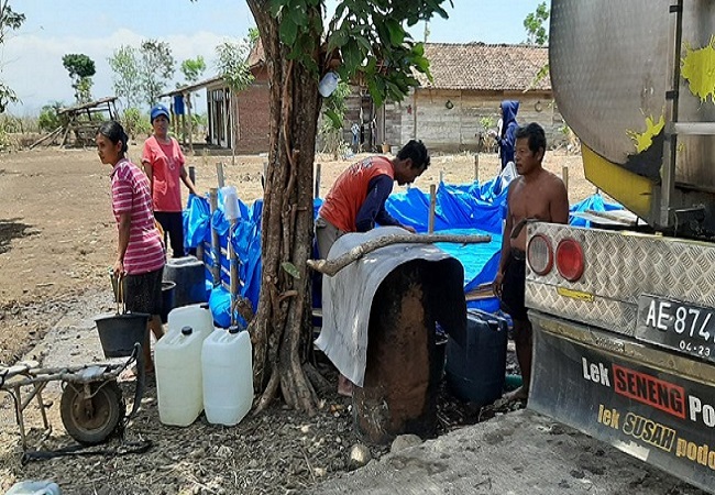 Krisis air bersih ini disebabkan oleh kemarau panjang yang menyebabkan kekeringan di daerah tersebut selama lebih dari tiga bulan. Bantuan air bersih ini diletakkan pada bak penampungan yang telah dibuat sendiri oleh warga sekitar dengan alas terpal. Setiap warga mengambil air dengan menggunakan berbagai alat seperti jirigen, galon, dan lain sebagainya.