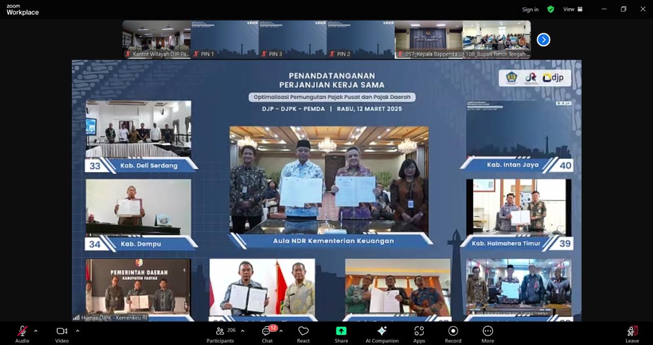 Direktorat Jenderal Pajak (DJP) dan Direktorat Jenderal Perimbangan Keuangan (DJPK) Kementerian Keuangan menyelenggarakan penandatanganan Perjanjian Kerja Sama Optimalisasi Pemungutan Pajak Pusat dan Daerah (PKS OP4D) antara DJP, DJPK, dan Pemerintah Daerah. Kegiatan penandatanganan dilakukan di Aula Nagara Dana Rakca Kementerian Keuangan dan diikuti secara daring oleh 129 kepala daerah di seluruh Indonesia. (Rabu, 12/3).