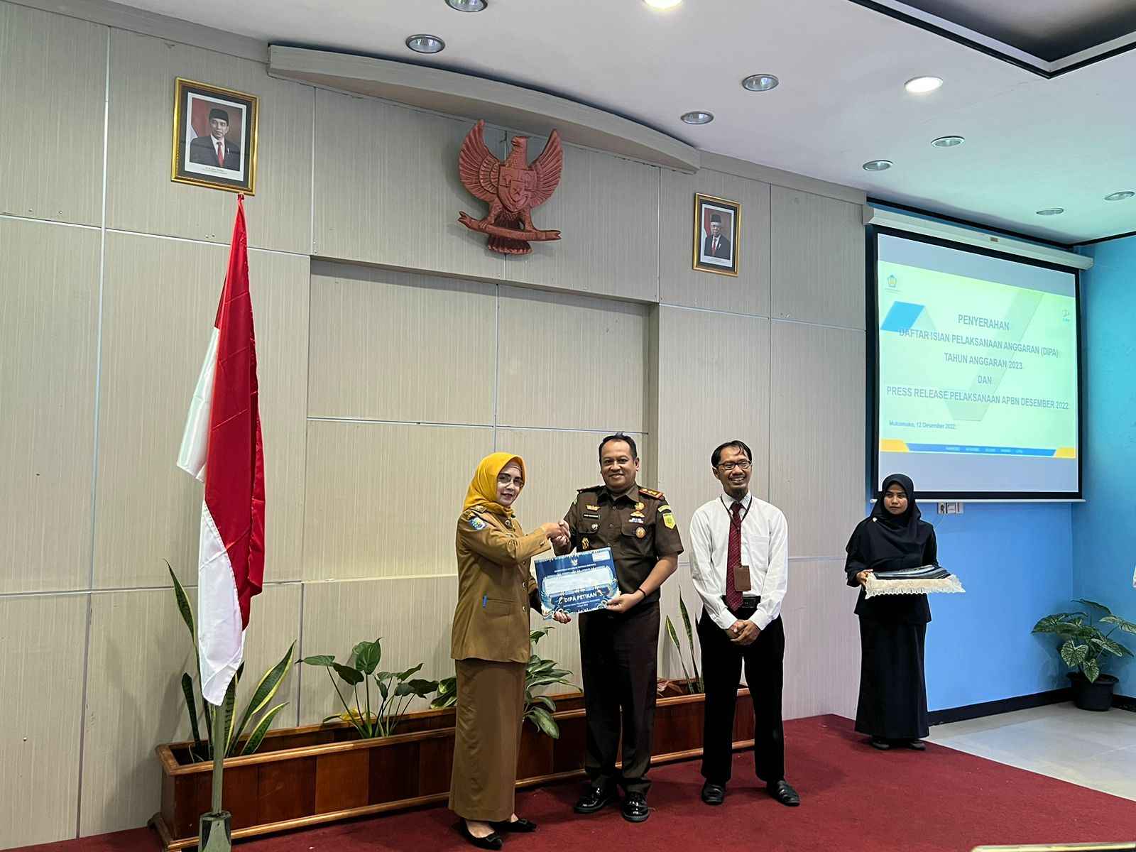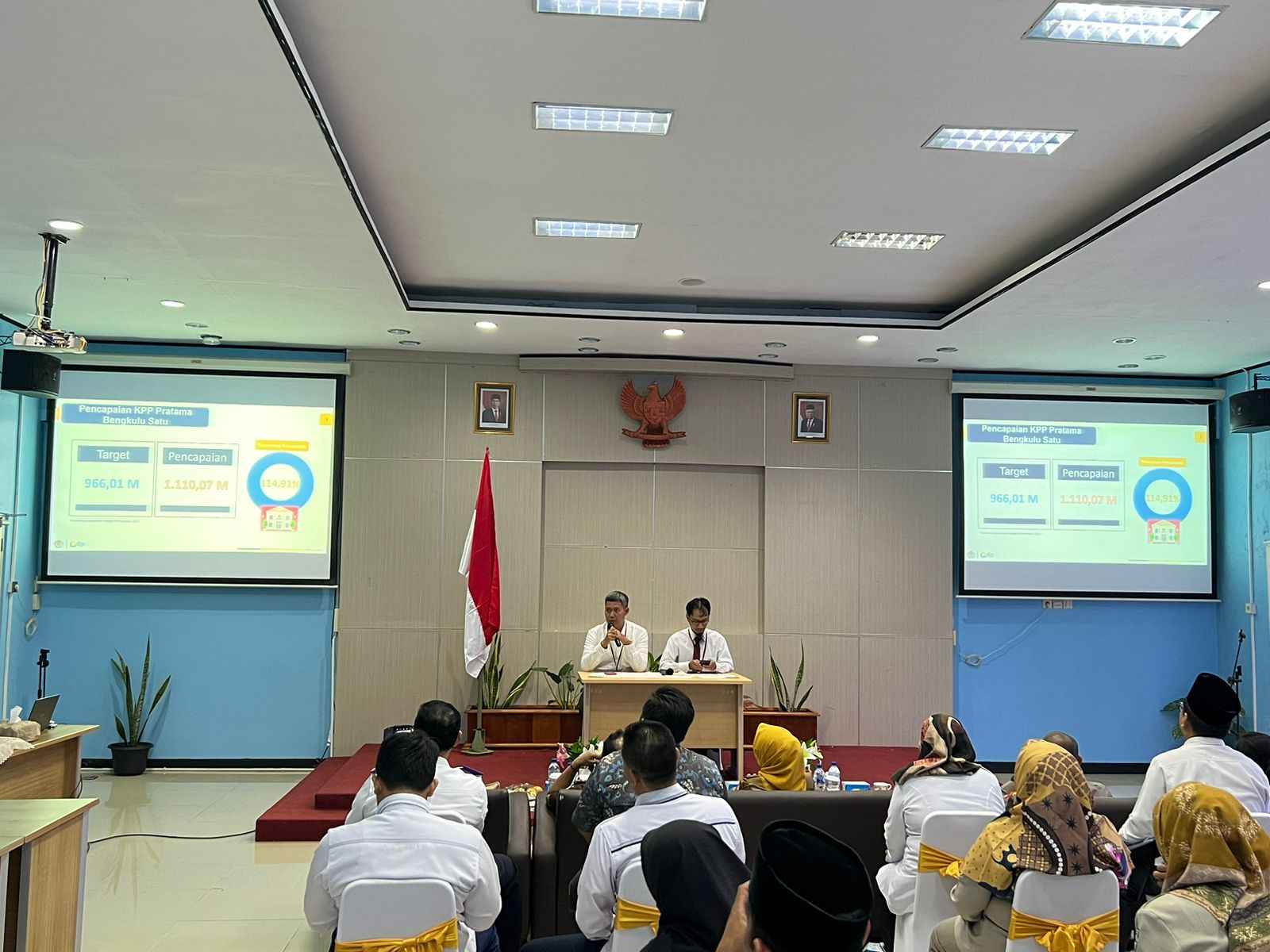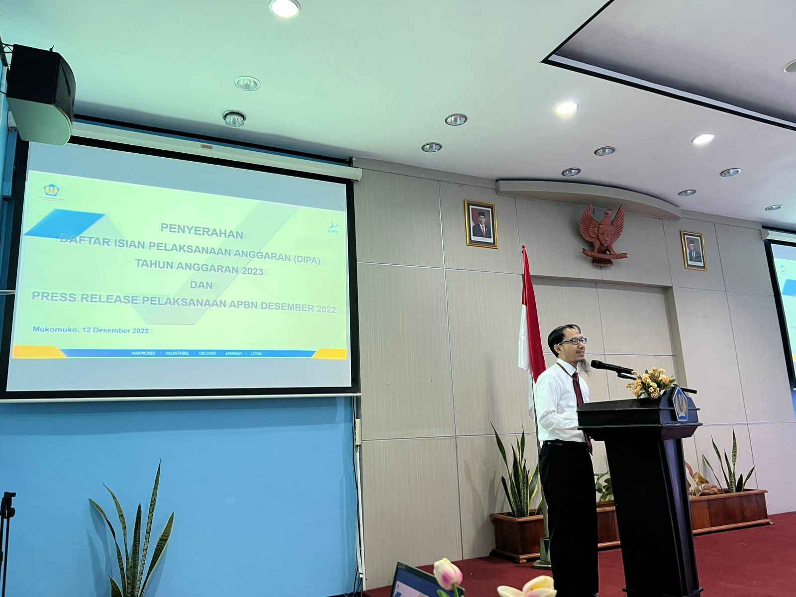 Kantor Pelayanan, Penyuluhan, dan Konsultasi Perpajakan (KP2KP) Mukomuko, bersinergi dengan Kantor Pelayanan Perbendaharaan Negara (KPPN) Mukomuko, menyelenggarakan kegiatan Press Release Pelaksanaan Anggaran Pendapatan dan Belanja Negara (APBN) Bulan Desember Tahun 2022 dan penyerahan Daftar Isian Pelaksanaan Anggaran (DIPA) Tahun Anggaran 2023 di Aula KPPN Mukomuko, Kabupaten Mukomuko (Senin, 12/12).