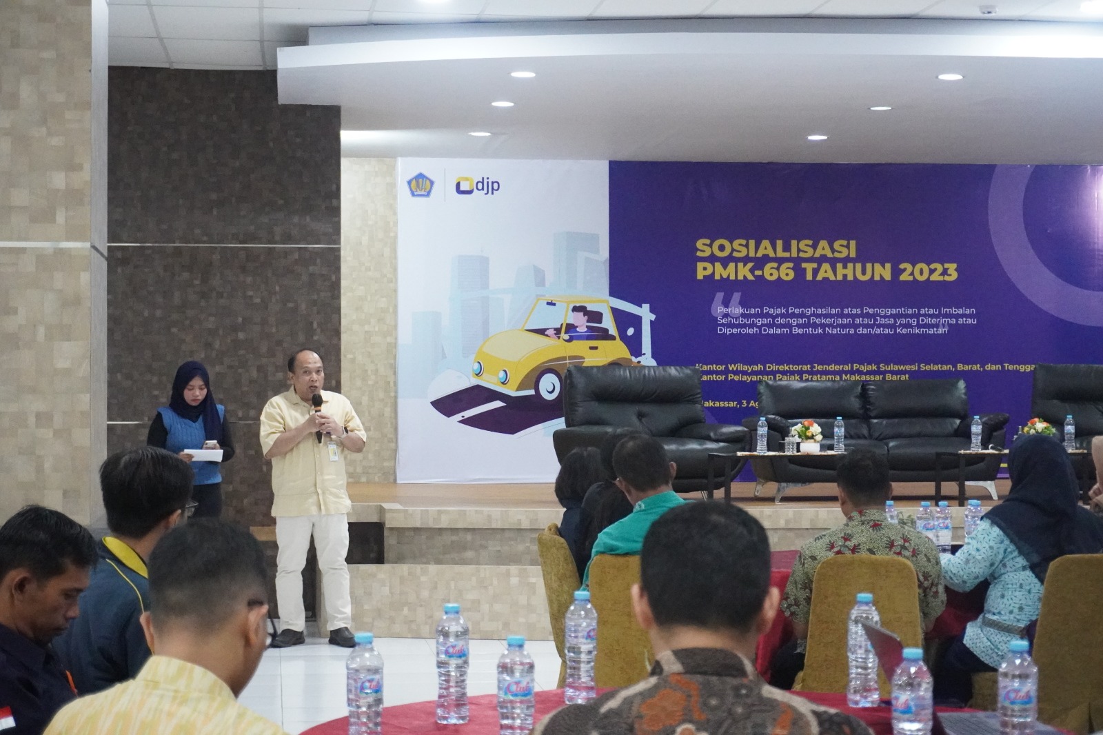 Kantor Pelayanan Pajak (KPP) Pratama Makassar Barat berkolaborasi dengan Kantor Wilayah (Kanwil) Direktorat Jenderal Pajak (DJP) Sulawesi Selatan, Barat dan Tenggara mengadakan kegiatan sosialisasi Peraturan Menteri Keuangan (PMK) Nomor 66 Tahun 2023 di Aula Gedung Keuangan Negara II Makassar, Kota Makassar (Kamis, 3/8).