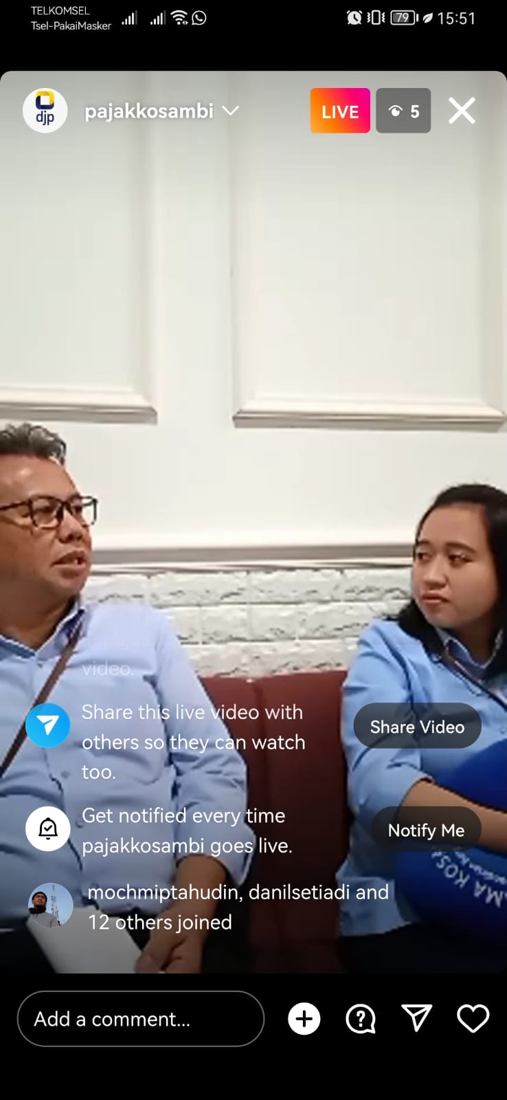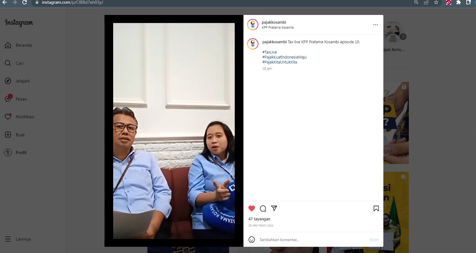Kantor Pelayanan Pajak (KPP) Pratama Kosambi menyiarkan secara langsung kegiatan Tax Live dengan tema e-Pbk melalui akun media sosial Instagram KPP Pratama Kosambi @pajakkosambi langsung dari KPP Pratama Kosambi, Kota Tangerang (Rabu, 16/11).