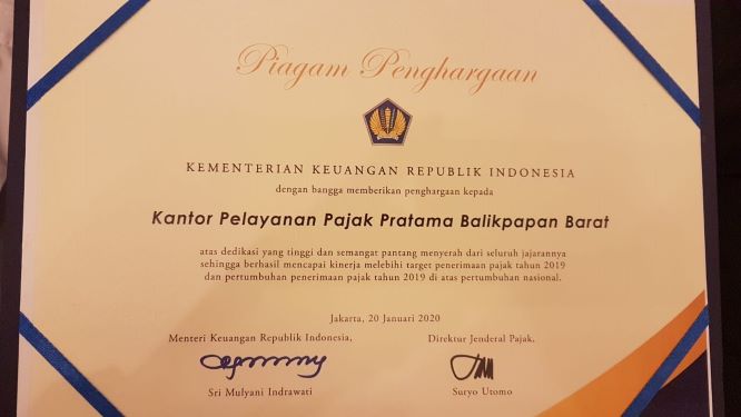 Kepala KPP Pratama Balikpapan Barat Efendi Pinem sebagai penerima penghargaan langsung oleh Menteri Keuangan Sri Mulyani Indrawati, turut mengucapkan terima kasih dan apresiasi sebesar-besarnya kepada seluruh pegawai KPP Pratama Balikpapan Barat yang telah memberikan kinerja terbaik. Tak lupa apresiasi juga diberikan kepada wajib pajak atas kontribusinya sehingga target penerimaan pajak KPP Pratama Balikpapan Barat tahun pajak 2019 dapat tercapai.