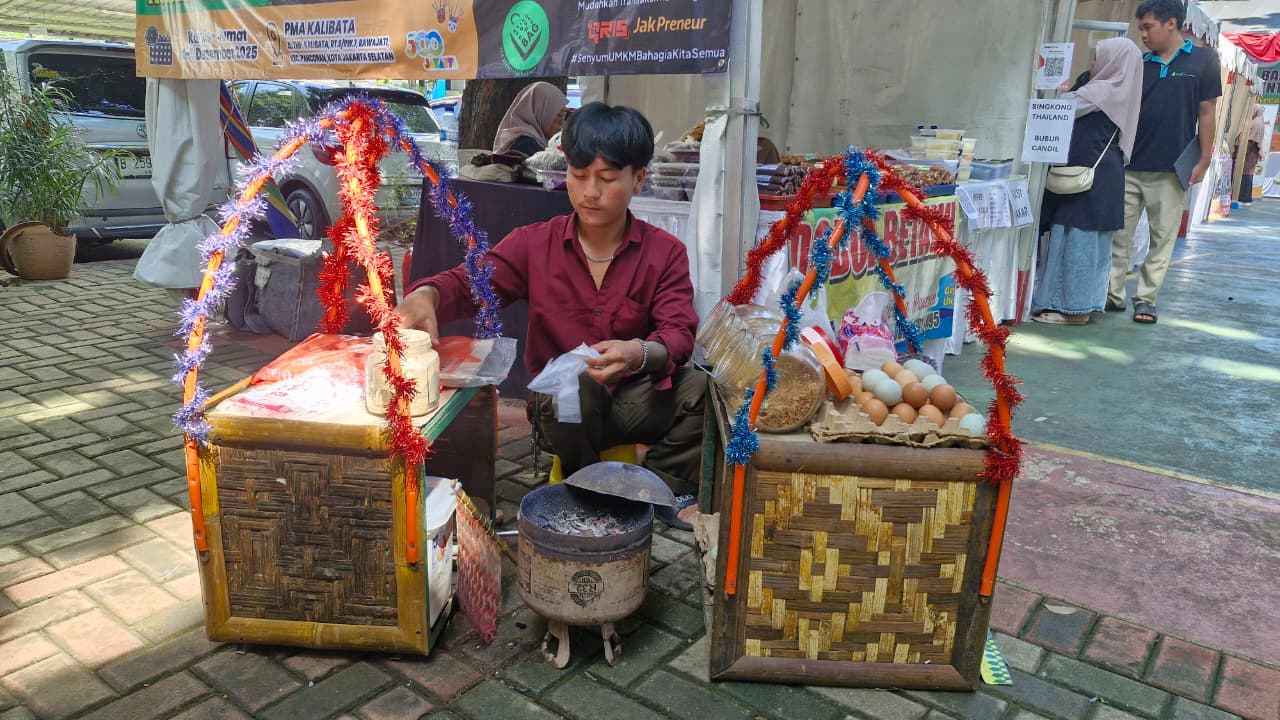 Sosok Arman Maulana, penjual kerak telur berusia 24 tahun, menjadi magnet yang menarik perhatian pengunjung dengan aroma dan cita rasa otentik Jakarta di Peringatan Hari Anti Korupsi Sedunia (Hakordia) 2025 yang berlangsung di Lapangan Komplek Pajak Kalibata, Jalan TMP Kalibata Nomor 19B, Jakarta Selatan (Jumat, 5/12).