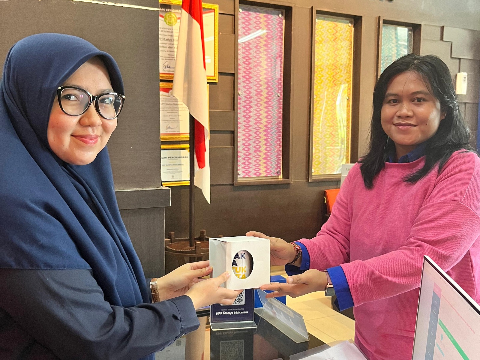 “Terima kasih, sudah diberi suvenir khusus ini dari KPP Madya Makassar,” ujar salah satu wajib pajak pengguna kartu Bypass.