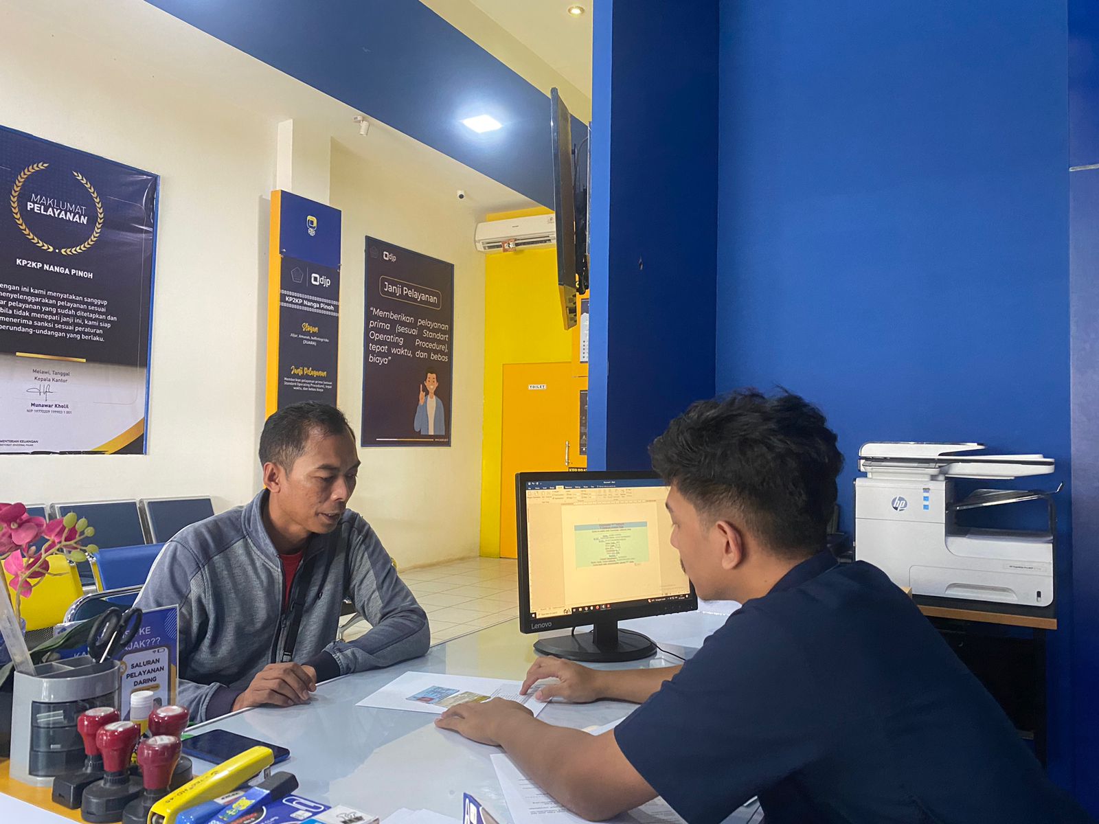 Wajib Pajak melakukan konsultasi terkait pelaporan surat pemberitahuan (SPT) bersama dengan Petugas Penyuluh Kantor Pelayanan, Penyuluhan, dan Konsultasi Perpajakan (KP2KP) Nanga Pinoh di ruang tempat pelayanan terpadu (TPT) KP2KP Nanga Pinoh, Kabupaten Melawi (Rabu, 16/10).