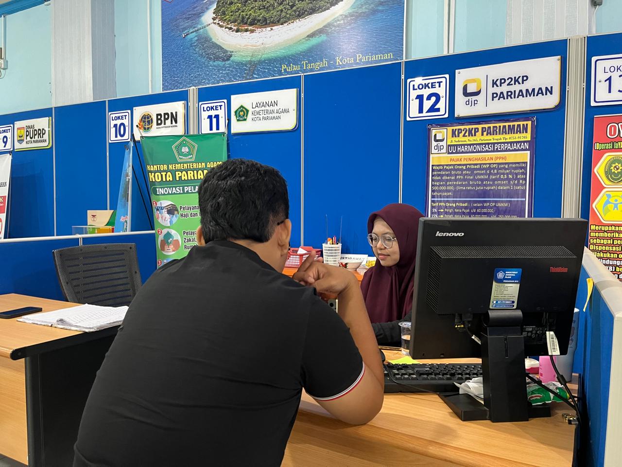 Kantor Pelayanan, Penyuluhan, dan Konsultasi Perpajakan (KP2KP) Pariaman memberikan edukasi kepada wajib pajak terkait cara membuat billing dan melakukan validasi Pengalihan Hak atas Tanah dan Bangunan (PHTB) di Mall Pelayanan Publik (MPP) Kota Pariaman (11/10). Kegiatan ini bertujuan untuk memudahkan wajib pajak yang ingin mengurus balik nama sertifikat tanah.