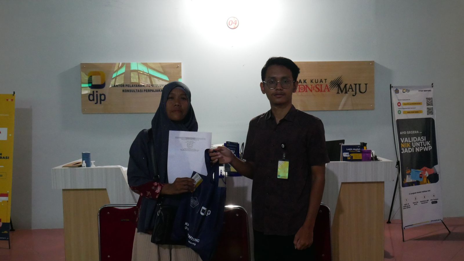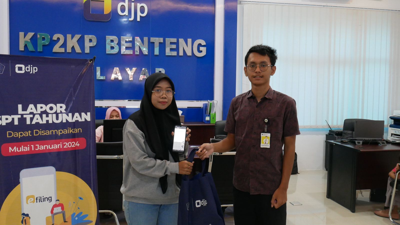 Pelaksana KP2KP Benteng Herdian Khrisna Murti dan Giri Lazuardi Hendrawan memberikan secara langsung souvenir kepada wajib pajak. “Pemberian souvenir kepada wajib pajak paling awal melaporkan SPT Tahunan merupakan kegiatan rutin di KP2KP Benteng setiap tahun,” jelas Giri.