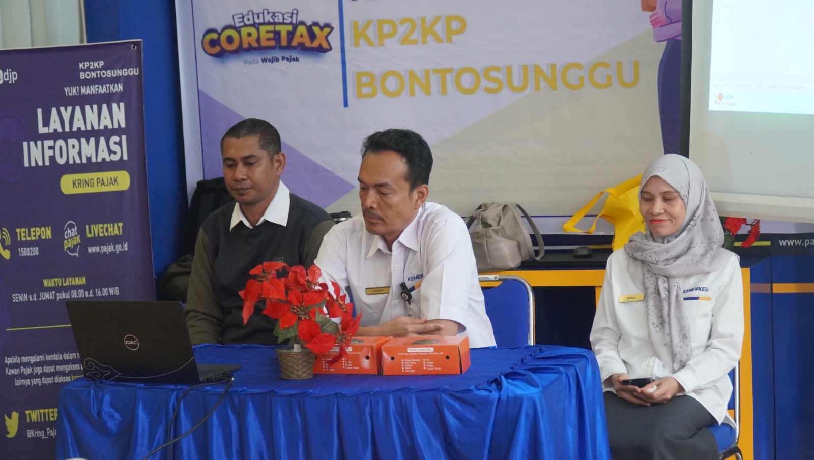 Kantor Pelayanan, Penyuluhan, dan Konsultasi Perpajakan (KP2KP) Bontosunggu menggelar kegiatan sosialisasi sistem Core Tax Administration System atau yang dikenal dengan Coretax DJP kepada bendahara desa se-Kabupaten Jeneponto (Senin, 28/7). Kegiatan ini dilaksanakan di Aula Kantor KP2KP Bontosunggu dan diikuti oleh puluhan bendahara desa dari berbagai wilayah di Kabupaten Jeneponto.