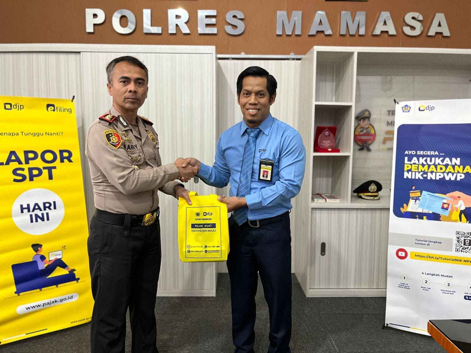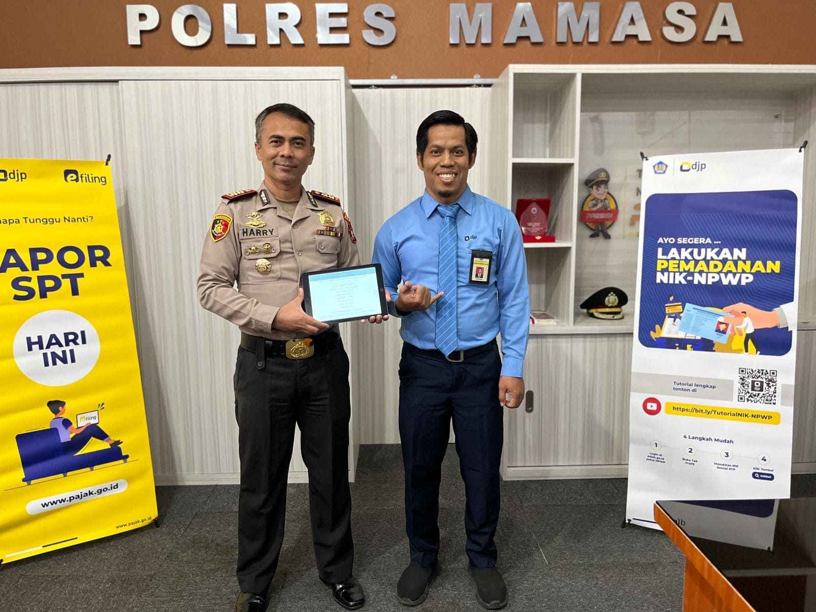 Kepala Kantor Pelayanan, Penyuluhan, dan Konsultasi Perpajakan (KP2KP) Mamasa melakukan kunjungan ke Polres Mamasa (Rabu, 1/2). Kunjungan ini bertujuan untuk mengimbau seluruh anggota kepolisian di Polres Mamasa untuk melakukan pemadanan data mandiri sebagai implementasi Nomor Induk Kependudukan (NIK) sebagai Nomor Pokok Wajib Pajak (NPWP).