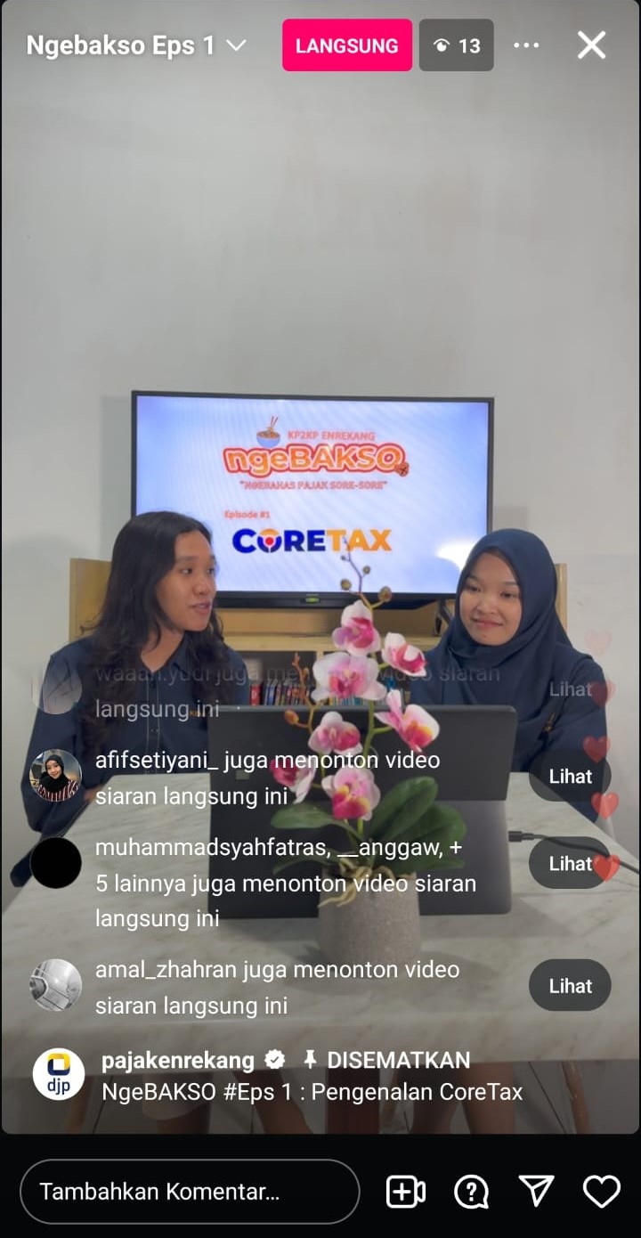 Kantor Pelayanan, Penyuluhan dan Konsultasi Perpajakan (KP2KP) Enrekang mengadakan siaran langsung dengan tema “Pengenalan Coretax” pada akun resmi media sosial Instagram KP2KP Enrekang @pajakenrekang yang bertempat di KP2KP Enrekang (Rabu, 31/7).
