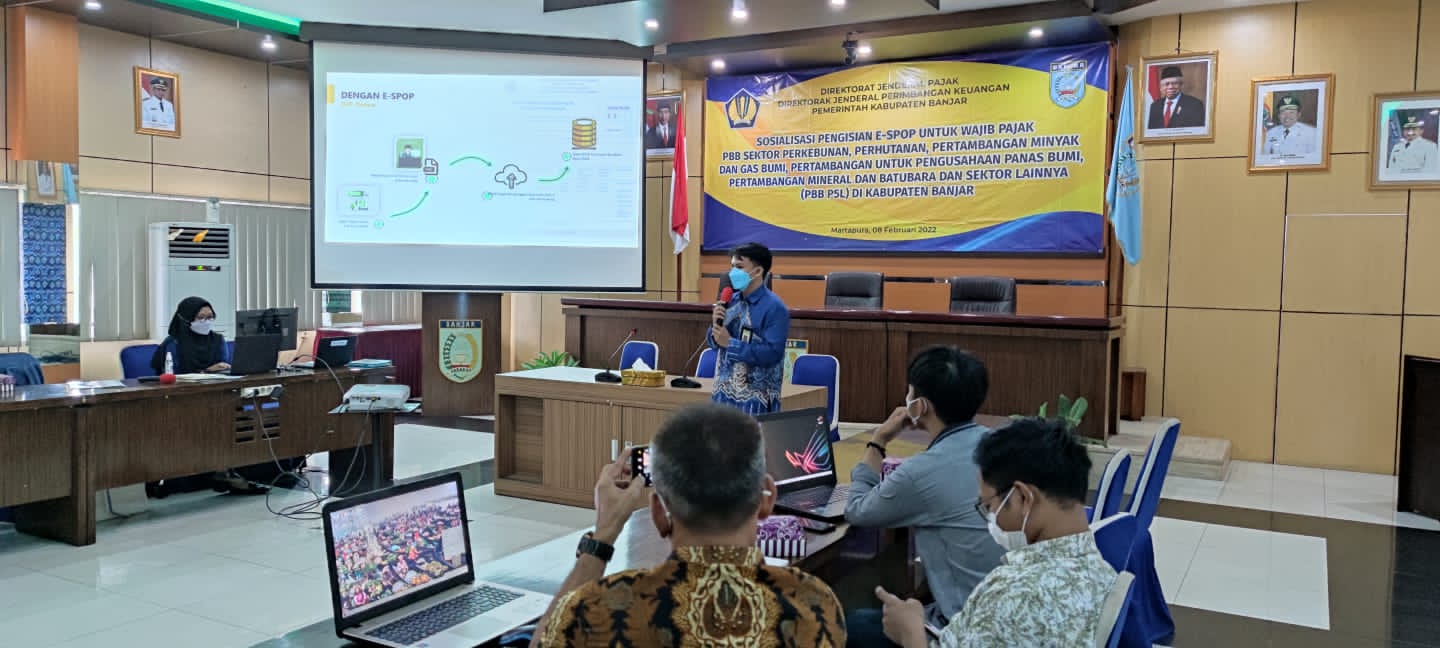 KP2KP Martapura bersama KPP Pratama Banjarbaru memberikan penyuluhan Program Pengungkapan Sukarela (PPS) dan pelatihan pengisian e-SPOP untuk Wajib Pajak PBB Sektor Perkebunan, Sektor Perhutanan, Sektor Pertambangan Minyak dan Gas Bumi, Sektor Pertambangan untuk Pengusahaan Panas Bumi, Sektor Pertambangan Mineral atau Batubara, dan Sektor Lainnya (P5L) di wilayah Kabupaten Banjar, bertempat di Aula Barakat Kabupaten Banjar (Selasa, 8/2).