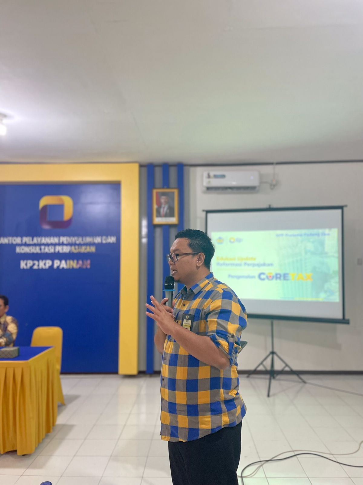 Kantor Pelayanan Pajak (KPP) Pratama Padang Dua bersama Kantor Pelayanan, Penyuluhan, dan Konsultasi Perpajakan (KP2KP) Painan mengadakan kegiatan bertajuk Edukasi Coretax yang dihadiri oleh wajib pajak dari sektor Perbankan di Kabupaten Pesisir Selatan (Selasa, 26/11).
